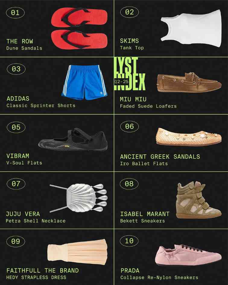 然而,FiveFingers「五趾鞋」在时尚圈的潜力实际上早就有所显露了。就在前几天,时尚数据机构与购物平台 LYST 发布的 2025 年第二季度榜单或许更具有说服力——其中在「最受欢迎单品」中,排名第五位的正是「Jennie 同款」的 V-Soul 鞋型。