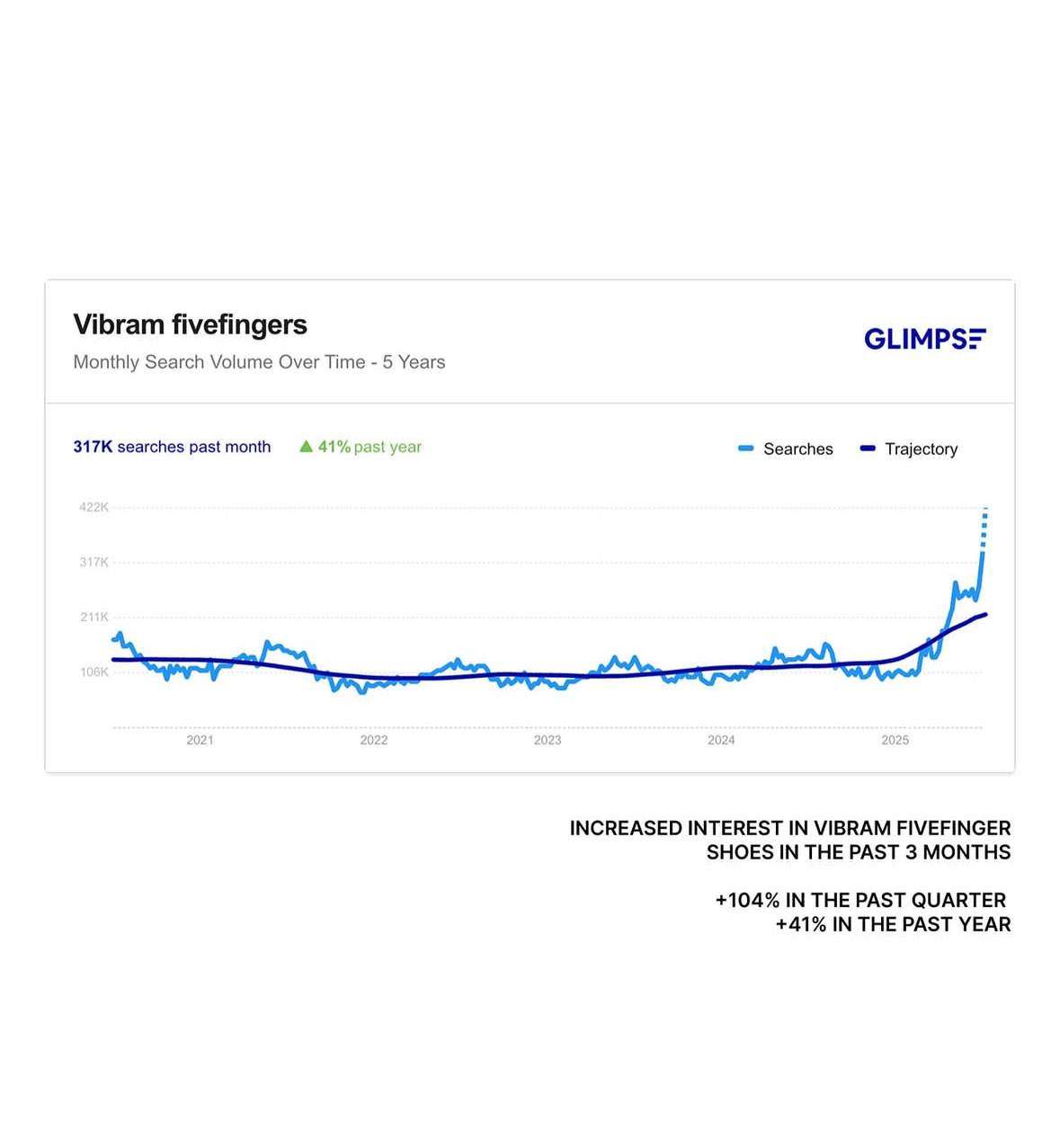 LYST 的榜单中提到,在 4 月至 6 月之间,用户对于 FiveFingers 的搜索量上涨了 110%,创下历史新高。而另一数据平台 GLIMPS 提供的数据则同样显示其搜索量与去年相比增长了 41%,过去三个月内的增幅更是达到了 104%,证明人们对这一产品的关注度在急剧上升。