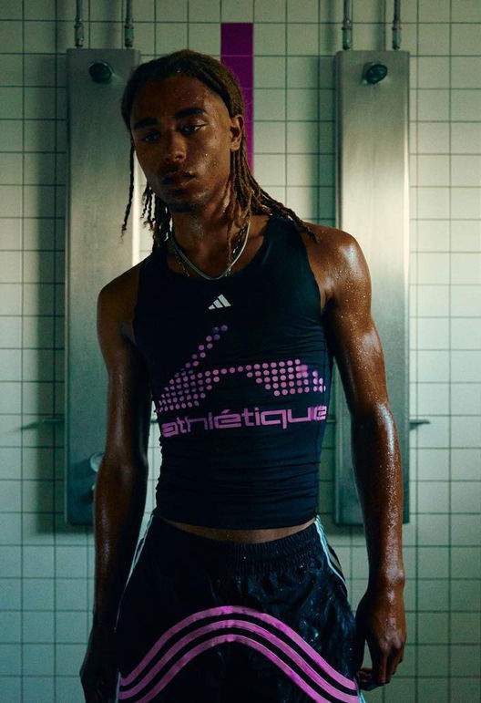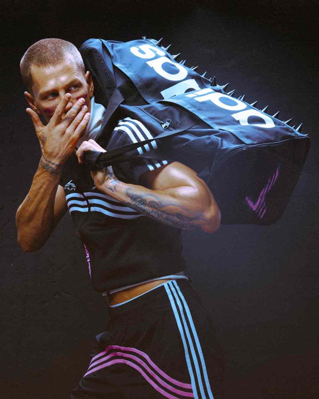 令人吃惊的不止是 adidas 突然为客制系列背书的做法,还有该行为同时也意味着 adidas 有意将这次的激进画风展现给数量庞大的普通消费者。超短 Beckenbauer Tracksuit,男士紧身 Tank Top,尖刺足球包,超长足钉的足球鞋以及 Logo、条纹和拍摄置景中都反复出现的亮粉色,不管是从廓形,配色选择还是型录拍摄,该系列所展现出来的强烈视觉效果无疑都有着向亚文化着装范畴靠拢的迹象。