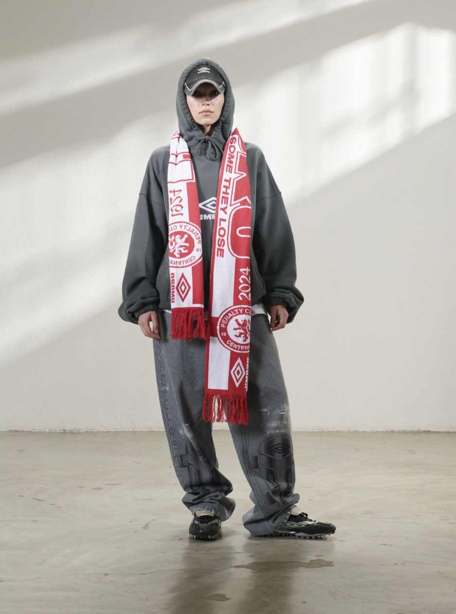 利用相同能力「兴风作浪」的还有 Slam Jam,与 Umbro 合作的 Penalty Culture 系列,聚焦于足球文化中的亚文化群体日常,透过不易察觉的文化背面进行反向审视,探讨足球文化中的「好坏与美丑」。融合「极端」人群着装特征的单品以及不寻常的设计角度,带来了极具冲击力的美学呈现,也成为今年 Umbro 崛起背后的重要推动力之一。