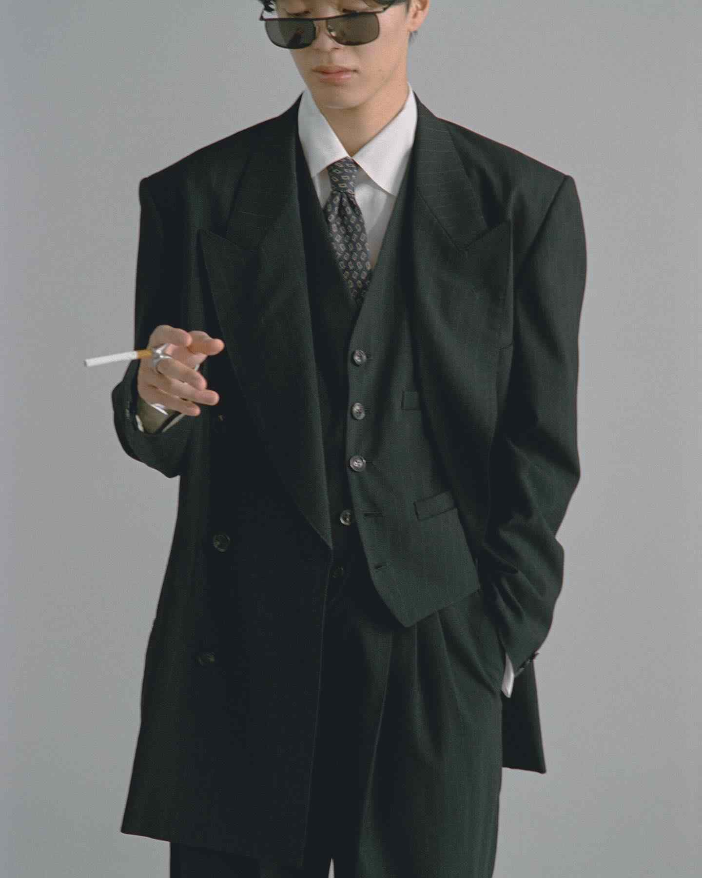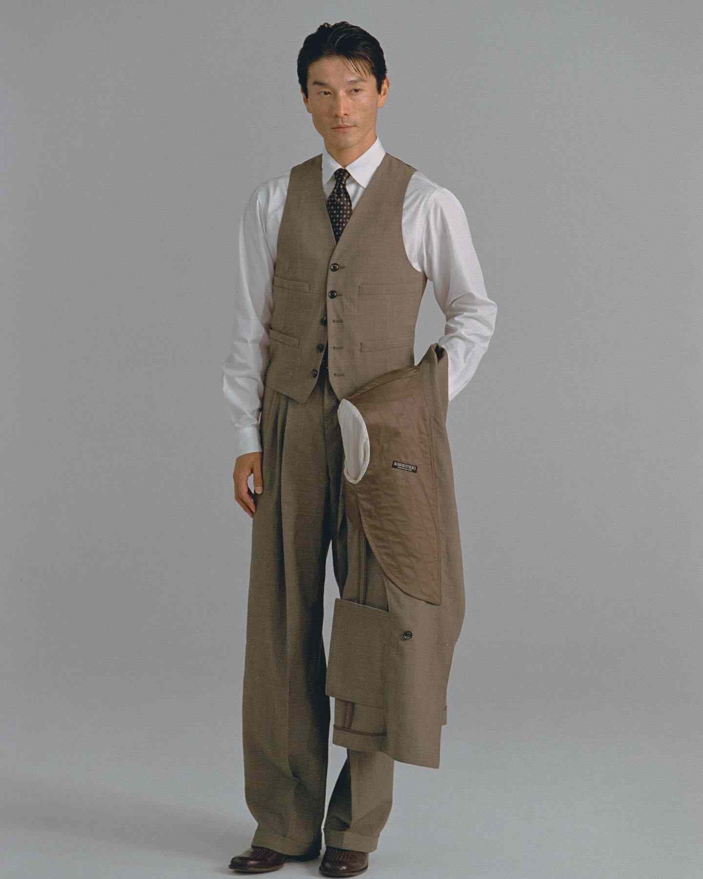 从 2024 秋冬系列开始 SOSHIOTSUKI 就将目光放到了日本本土的不同时代服饰氛围中来,而在不久前曝光的 2025 春夏系列则体现的更为明显,将日本上世纪 80~90 年代泡沫经济时期的男性着装风貌真实再现,宽大但稍显不合身的驳领西装,同样宽松盖住皮鞋多半个鞋面的西裤等等单品都十分传神,这种于当下审美语境中稍显局促的细节设定更具年代感,也在侧面展现了上世纪文艺黄金时代里男性对于服饰的诉求与真实细节。