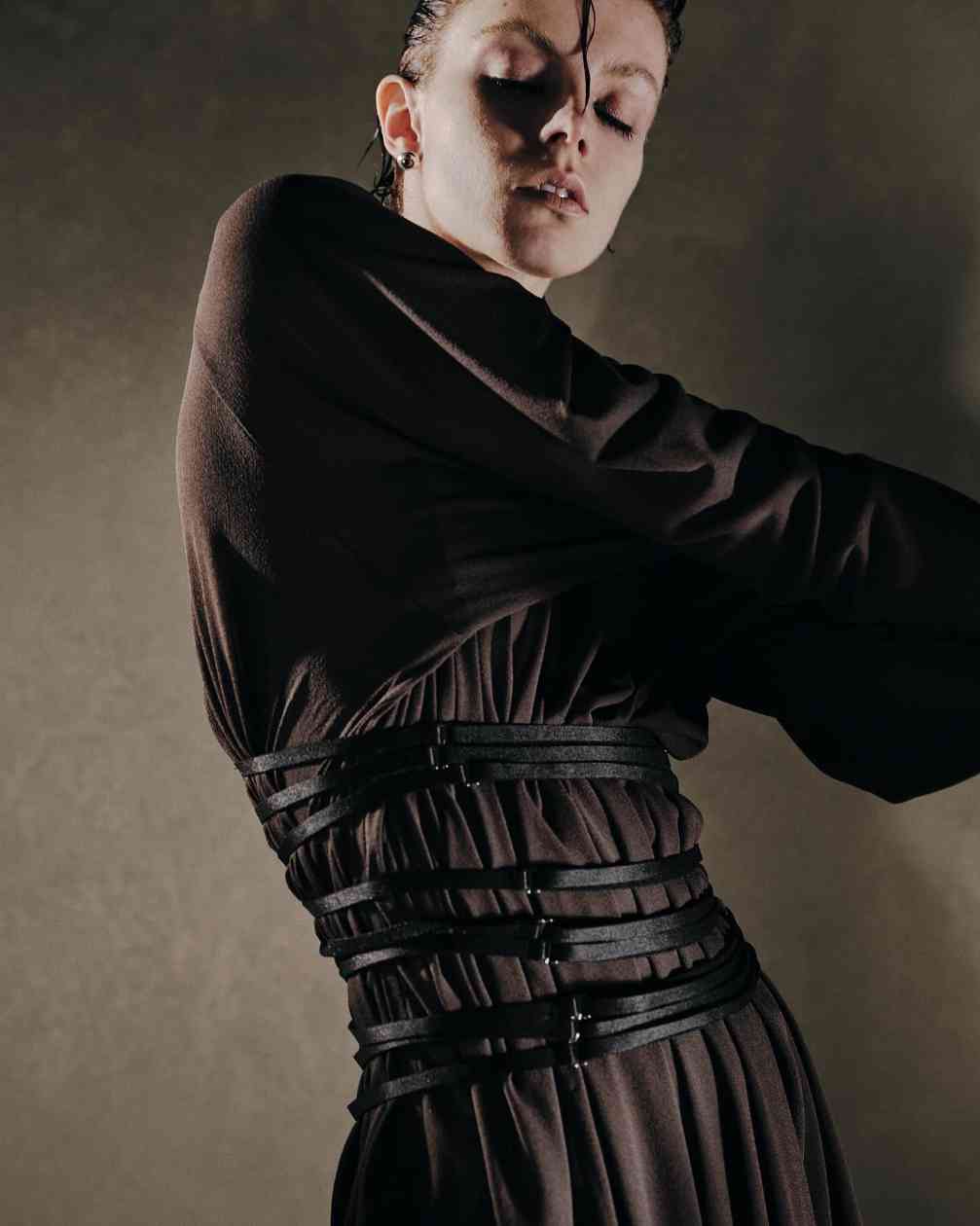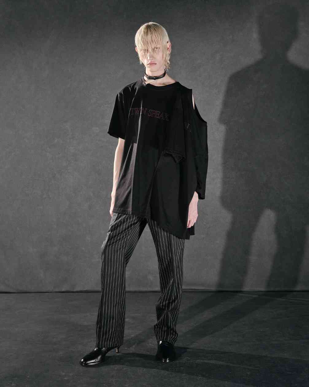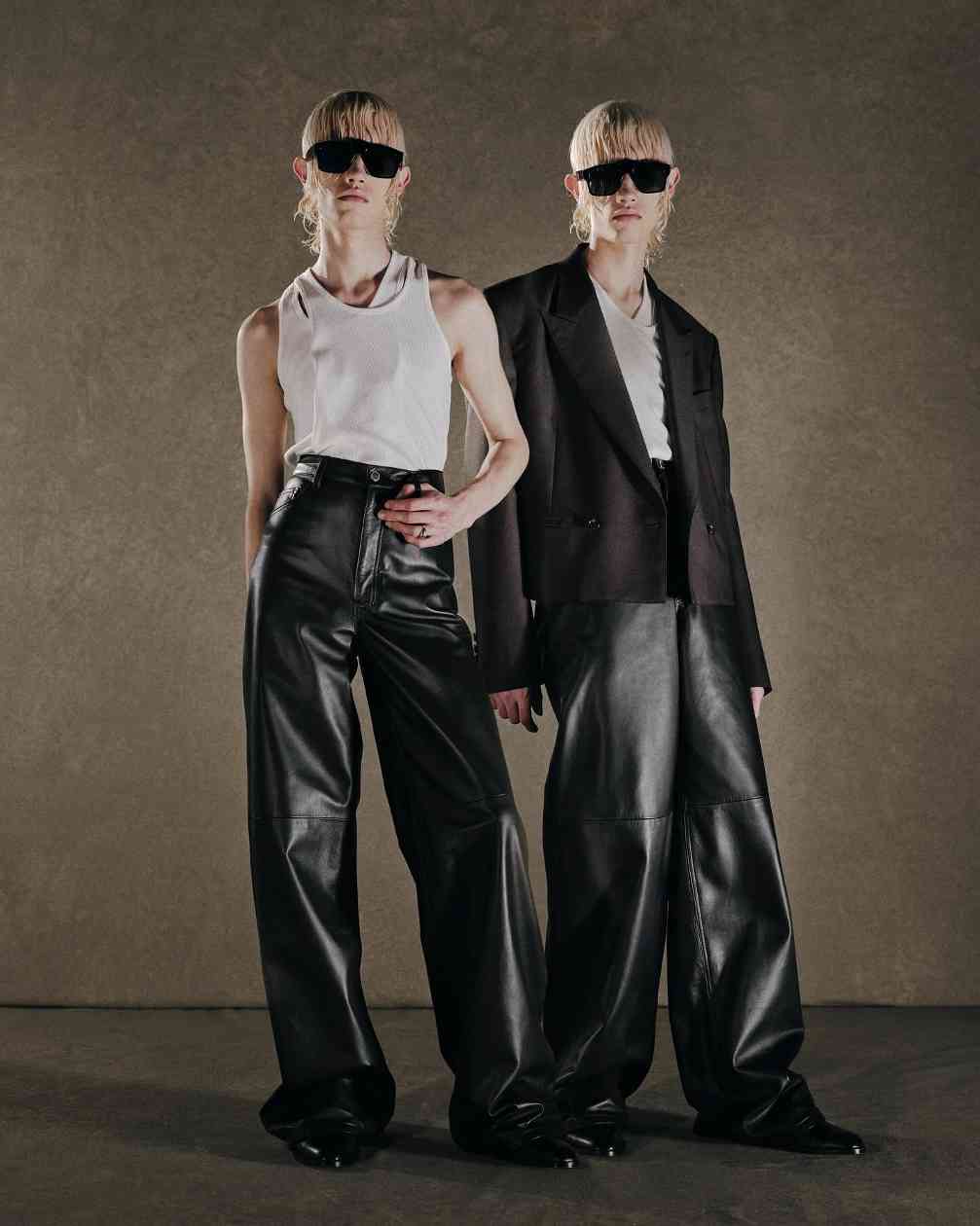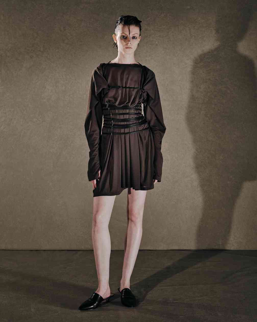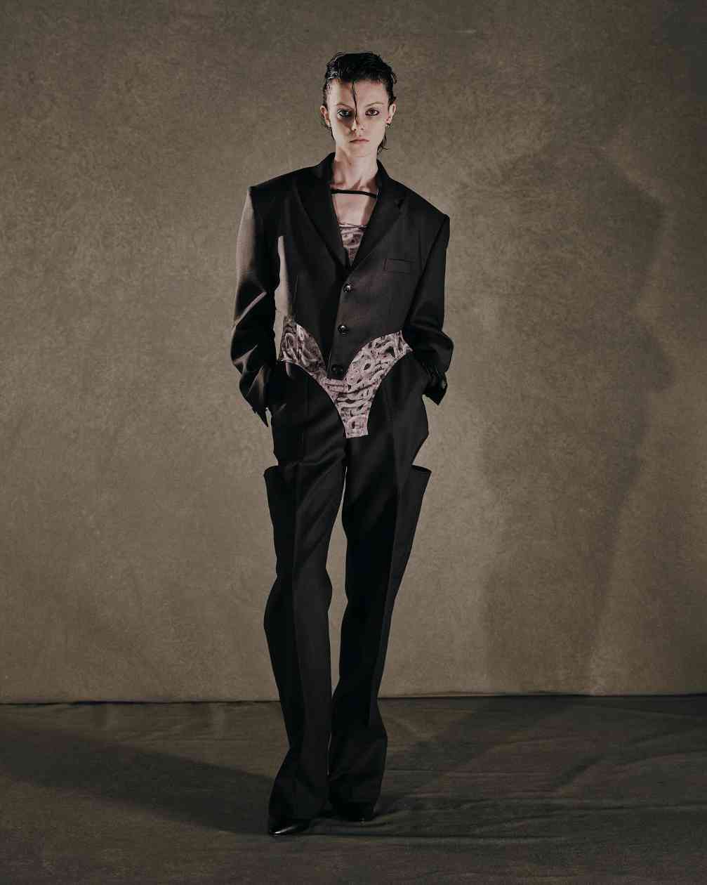 而女装则是将皮革束带、项圈以及内衣等亚文化中常见的元素与夹克或裙装相结合,呼应本次主题的禁忌神秘感。纵观 JOHN LAWRENCE SULLIVAN 的 2025 春夏系列,其实某种程度上也是此前「Stacking」主题系列的延伸,继续挖掘后朋克时代文化。