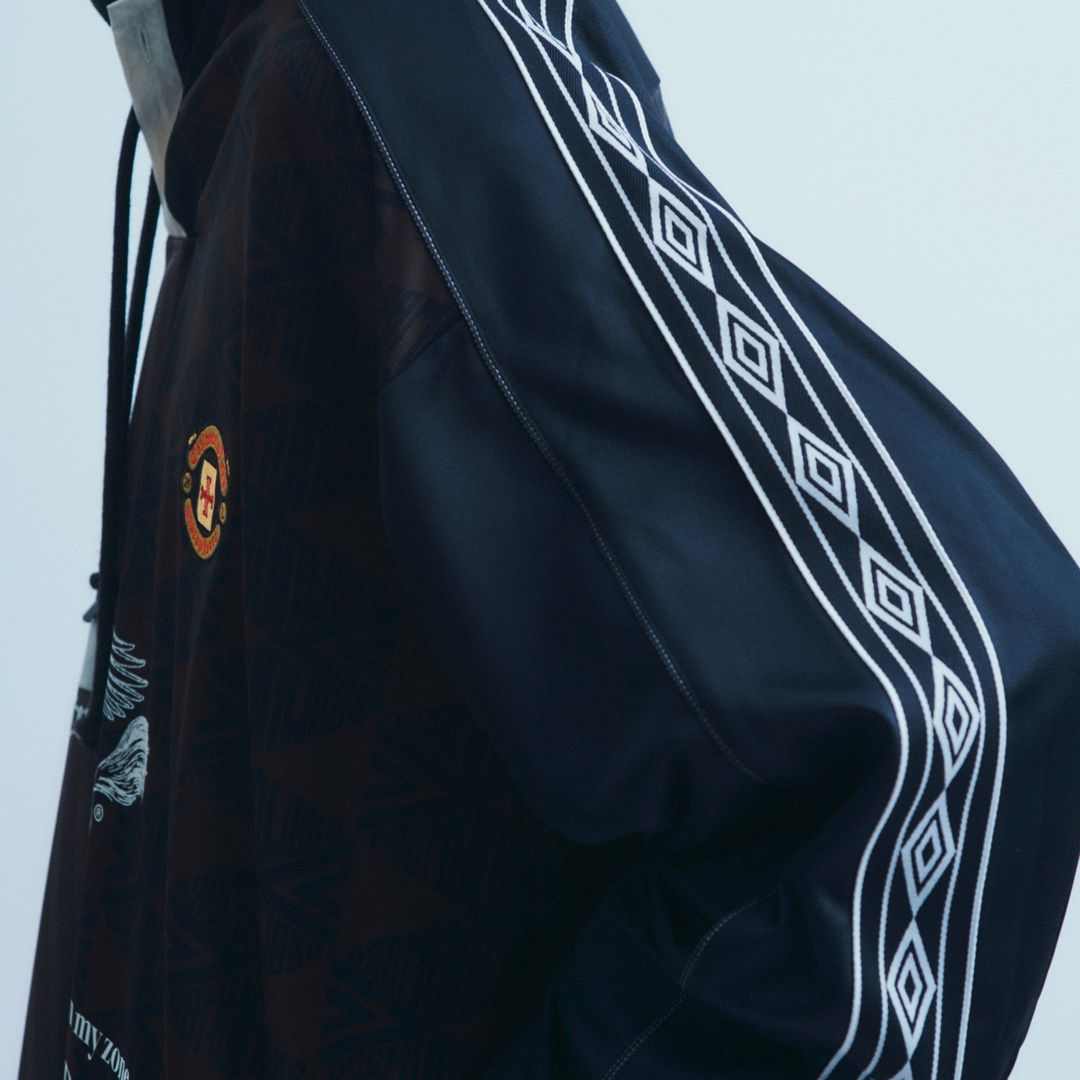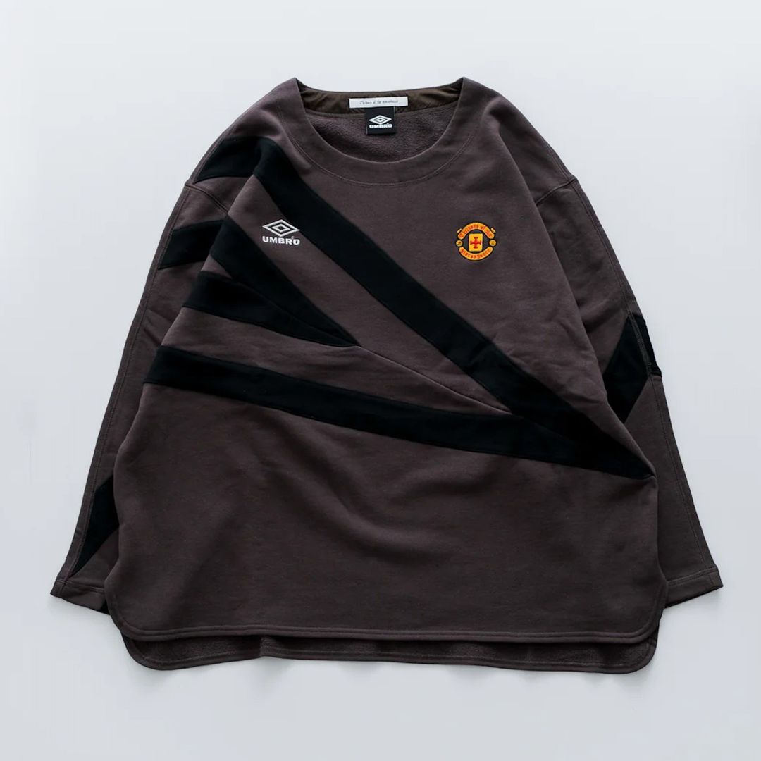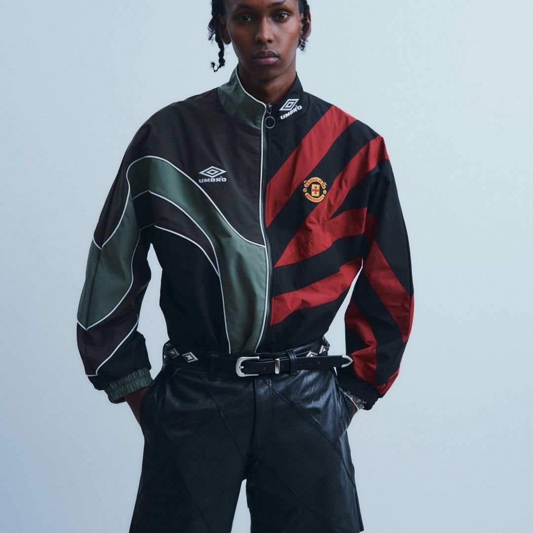 深入人心的经典 Umbro 回形 Logo、足球运动衫,以随意但极具视觉冲击力的方式排布;明暗、花色、颜色不一的不对称拼接手法,将带有强烈足球美学符号的标识性元素,呈现出兼具复古视感和前卫先锋时尚意境的新面貌。