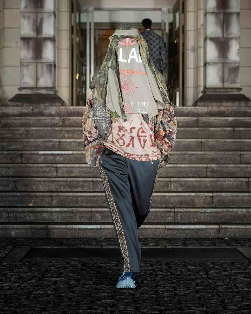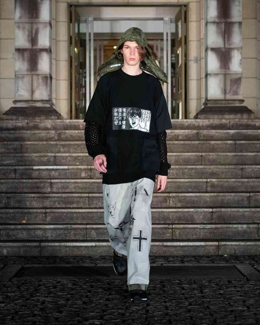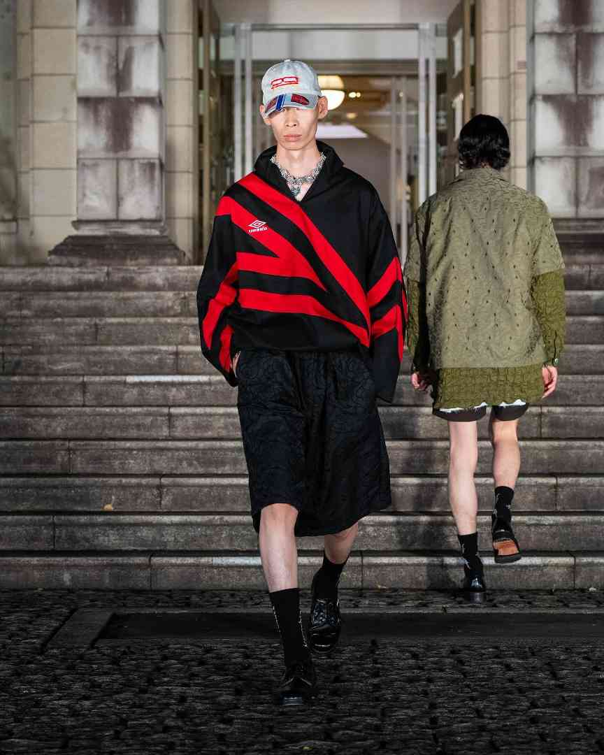 说他「陈旧」,是因为整季中最吸睛的作品,均来自基于 Umbro 运动服、AKIRA Vintage Tee 等经典复古物品的再创设计。而称其年轻,则很直观的可以通过其 Gen-Z 式的先锋美学画风,和挣脱既定风格框架的 Bootleg 设计思路一眼看出。