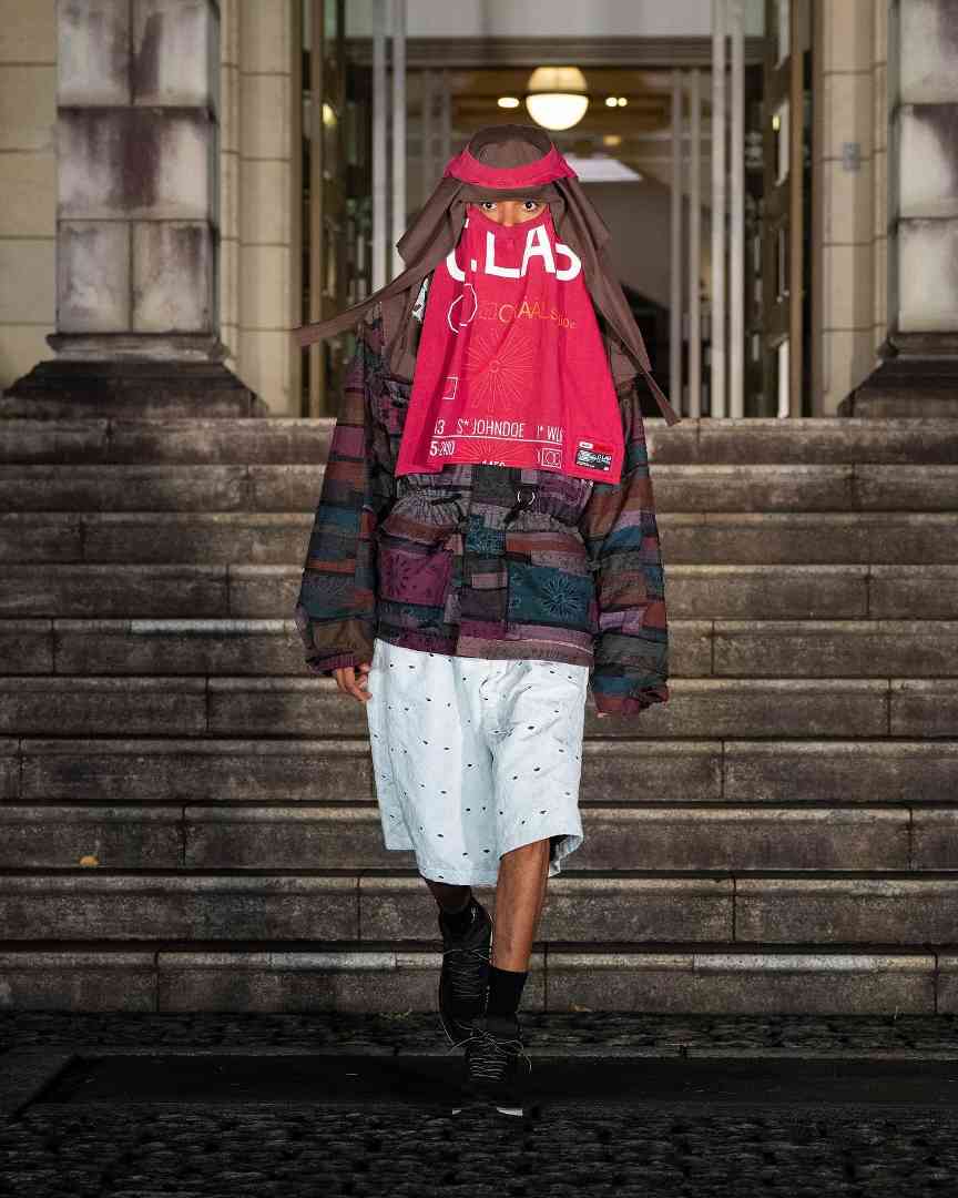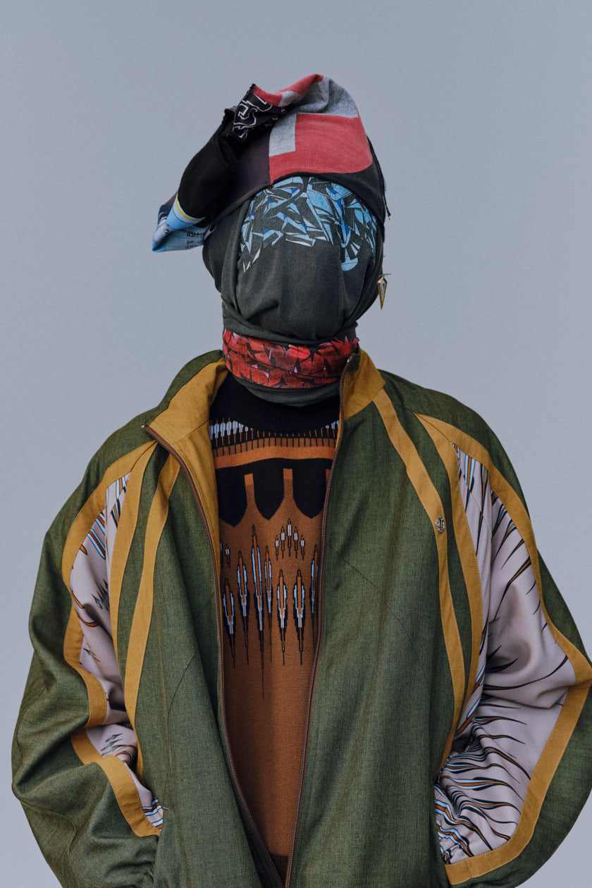 与时尚新锐 JOHNDOE 合作设计的单品,也同样是 Children of the Discordance 独到二创设计功力的体现。老旧字母球衣、迷彩打底衫等作为原料基础,通过同色或相近色的立体拼接,重组成具有神秘宗教氛围的巴拉克拉法帽,展现出极强的破格造型表现力。