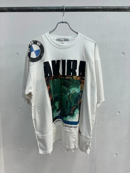 在 Vintage 类目中堪称「神物」级别的 80、90 年代 AKIRA Vintage Tee,通过多种老旧布料的二次拼接,改制成 Oversized 宽松版型;与此同时,发黄程度和粗糙质感不一的层次重组效果,以及诸如 BMW、复古主题贴画元素的拼叠、随意散落的收线毛须等细节,将单品的丰富立体感、自由松弛感也予以了重塑。