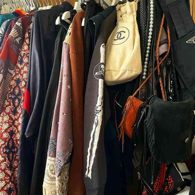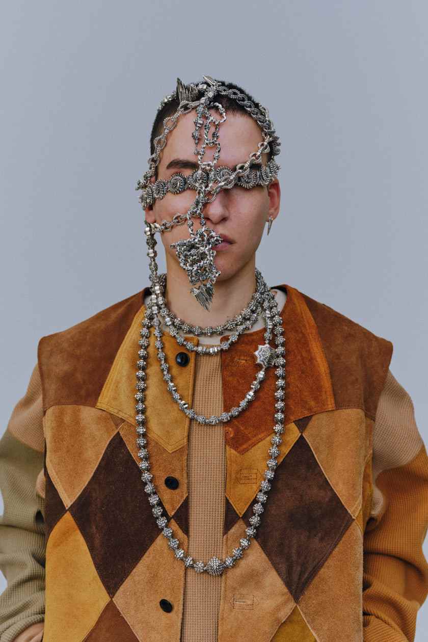即便是诸如 Goro’s、Chrome Hearts 之类的银饰品牌,Hideaki Shikama 也能通过古布丝巾、串珠等物件与不同吊坠、戒指的随机组合,打造出跳脱品牌原有风格定式的、或民族风韵、或刚柔并济的融合感面貌。