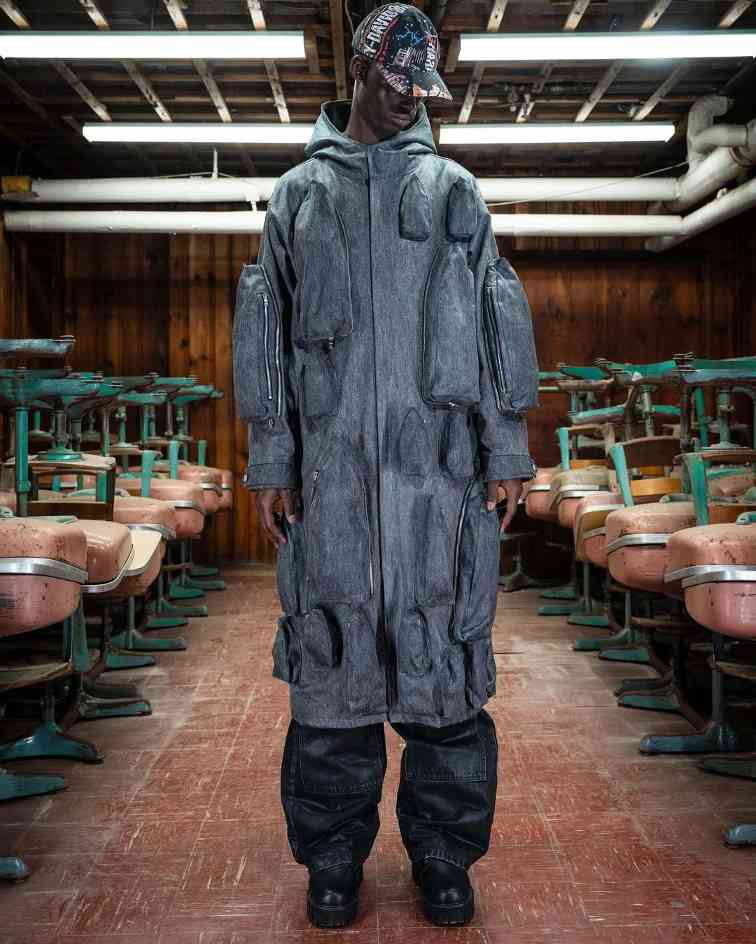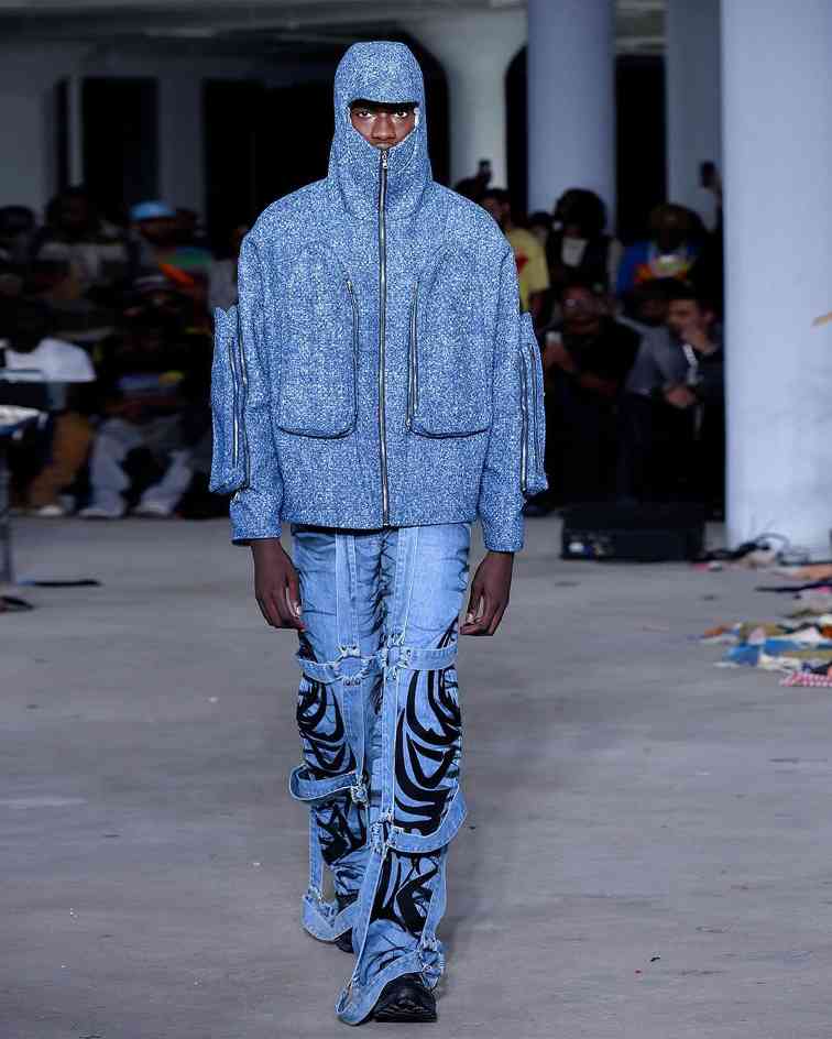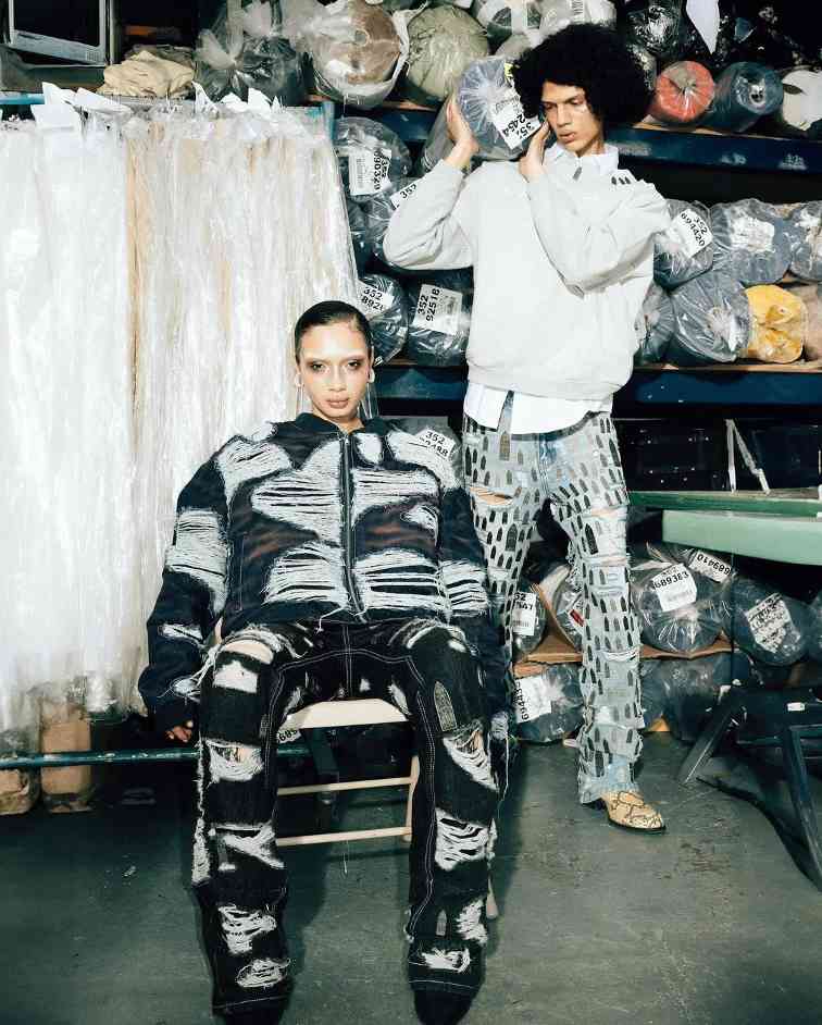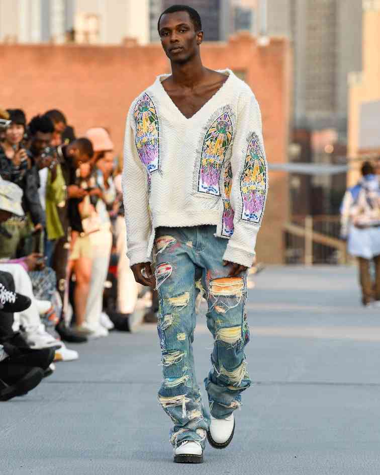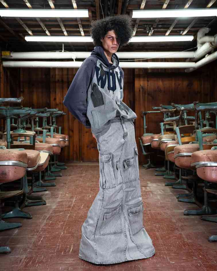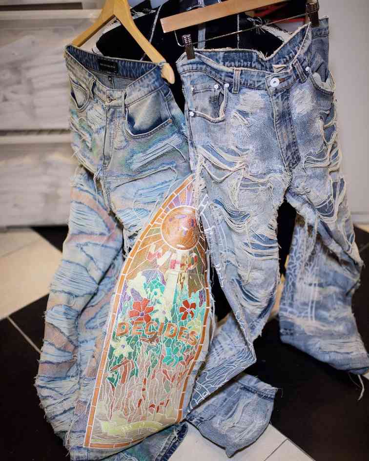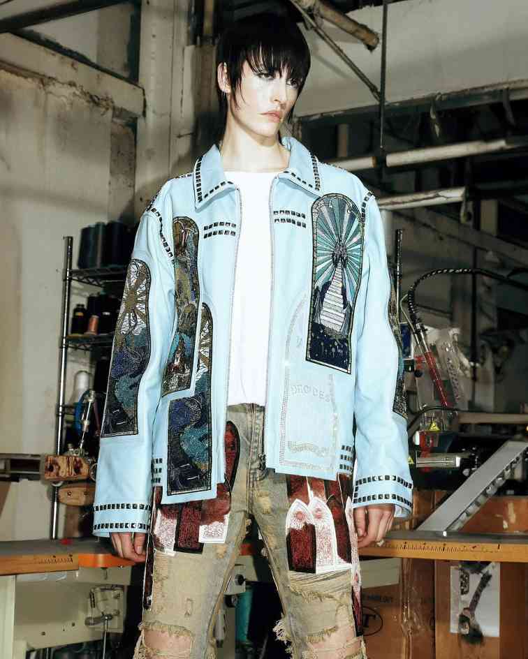 Who Decides War 打响名声的标志性单品中,诸如城堡牛仔夹、糜烂刺绣牛仔裤等,在第一眼视觉上,同样极具冲击力;但从长期定义而言,其仍隶属于「高调张扬」派系的街头风格语境,很难直接与「设计师时装」划上等号。