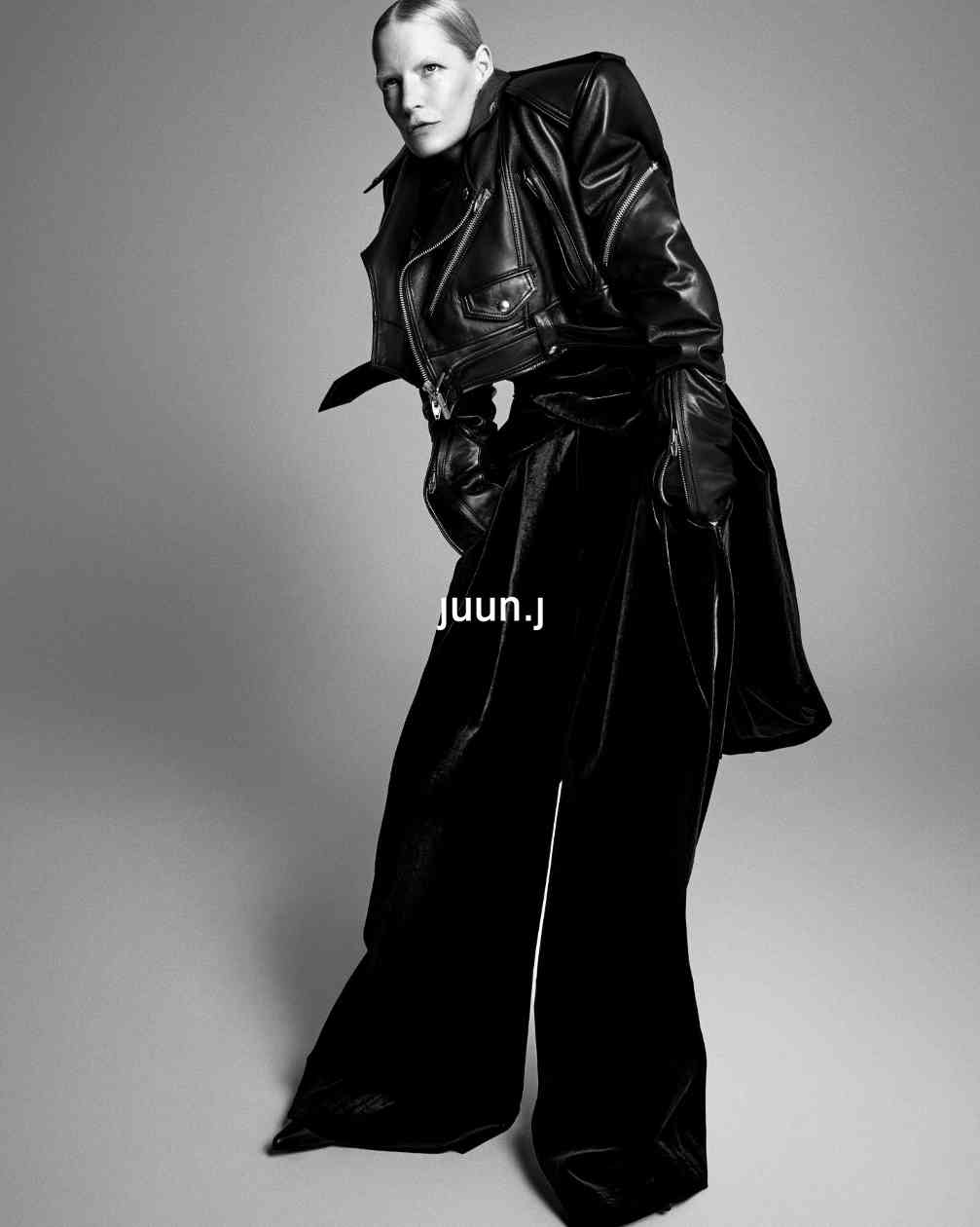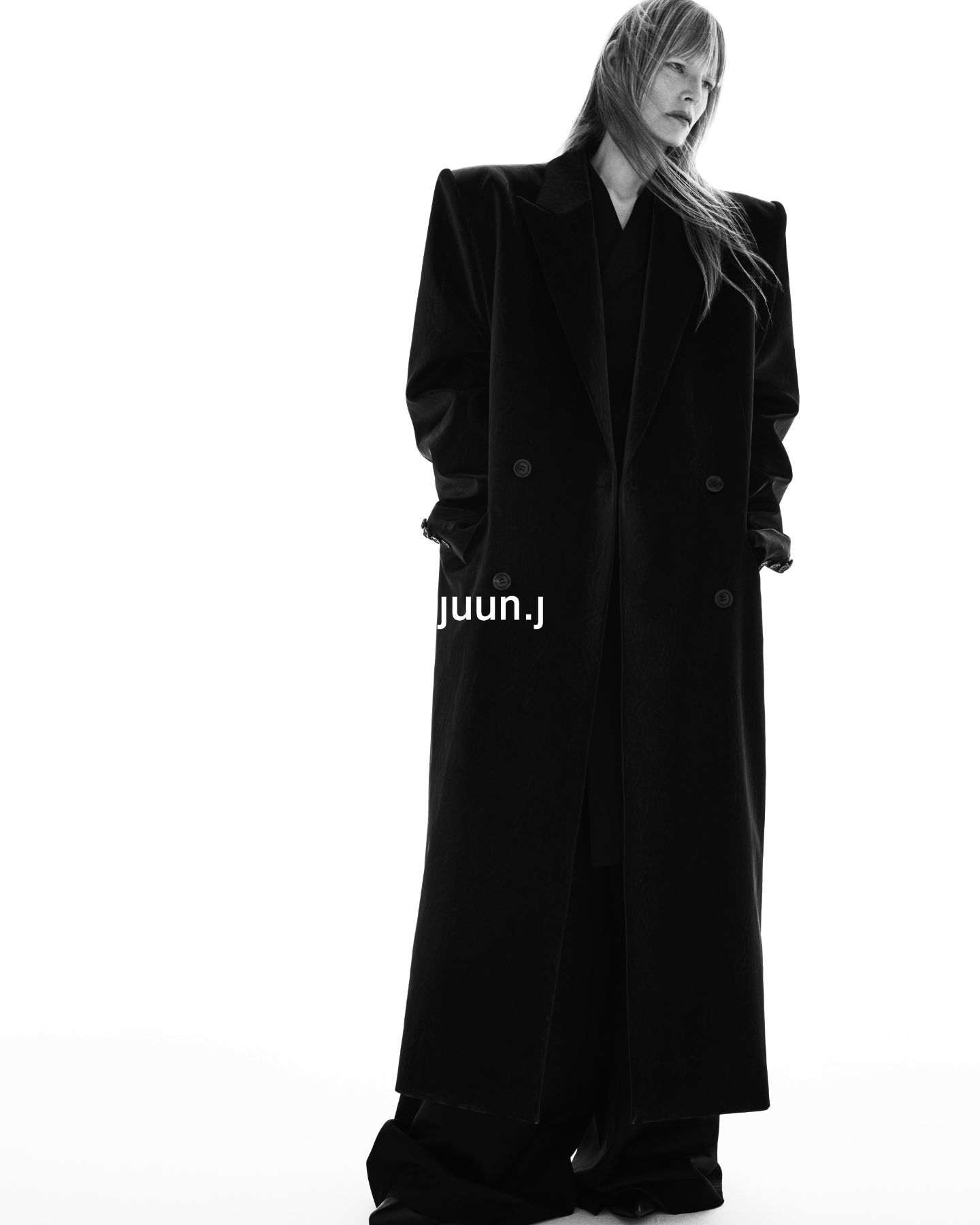 在 JUUN.J 的 2024 秋冬系列中品牌设计团队再次对于以往擅长的黑色给出了颇具层次感的诠释,军工装实验性的改造以及女装层面极简主义的呈现赋予整个系列极高的完成度与神秘感,尽管收起了尖锐的表达,但建筑感的线条仍旧搭建出超现实的体系性,譬如垫肩的西装、机车夹克以及双排扣大衣。