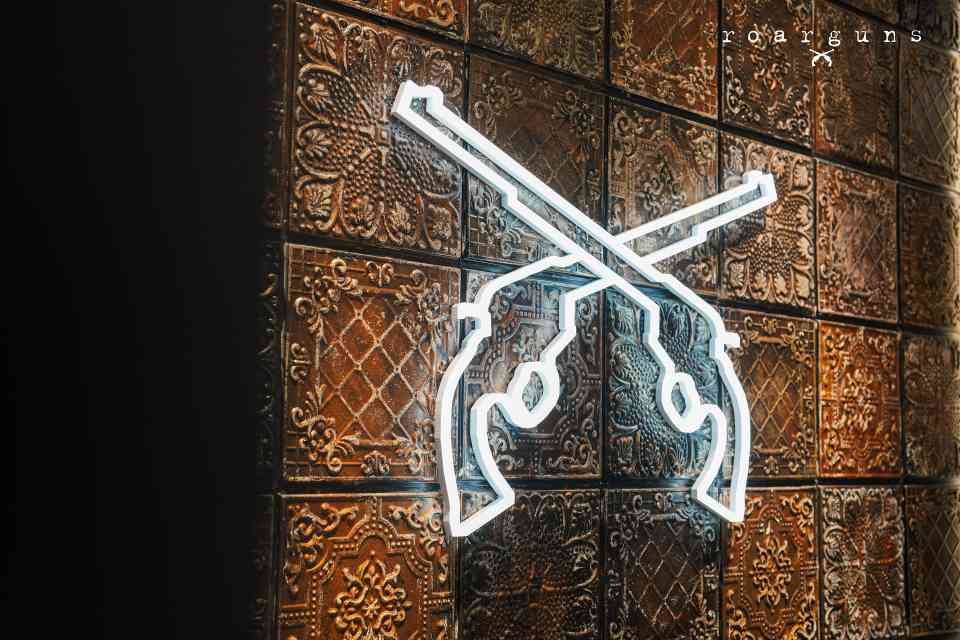 roarguns 上海首店将末日废土美学与未来赛博朋克风格完美融合,缔造出一个兼具复古质感与极简之道的趣味空间。店铺的设计以左右对称为规划基础,前台后方以霓虹光影点亮品牌经典标志「CROSSGUNS」,象征着品牌的设计灵魂。店内黑色钢柱与砂浆墙面相结合,LED 线型照明为空间注入了别样的深度感。