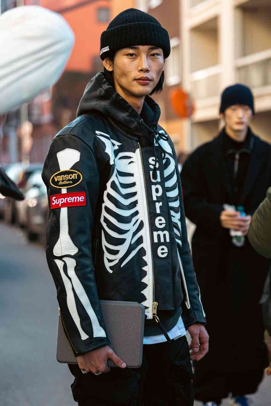 尽管 Vanson Leathers 从未离开过街头语境,早在 2017 年就与如日中天的 Supreme 推出过联名版本的骸骨机车皮衣,彼时双方创造了夸张的溢价,但 Vanson Leathers 并没有吃到这波红利借此进入大众视野,却在如今街头时尚全面颓势的环境下破圈,也能看出深厚的品牌积淀与运动文化呈现出的历久弥新成为当下全新的流行趋势缪斯。
