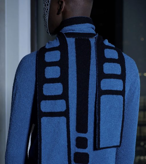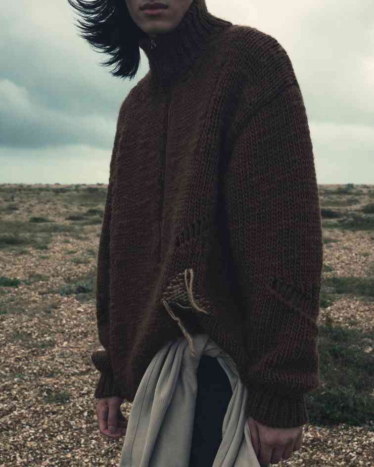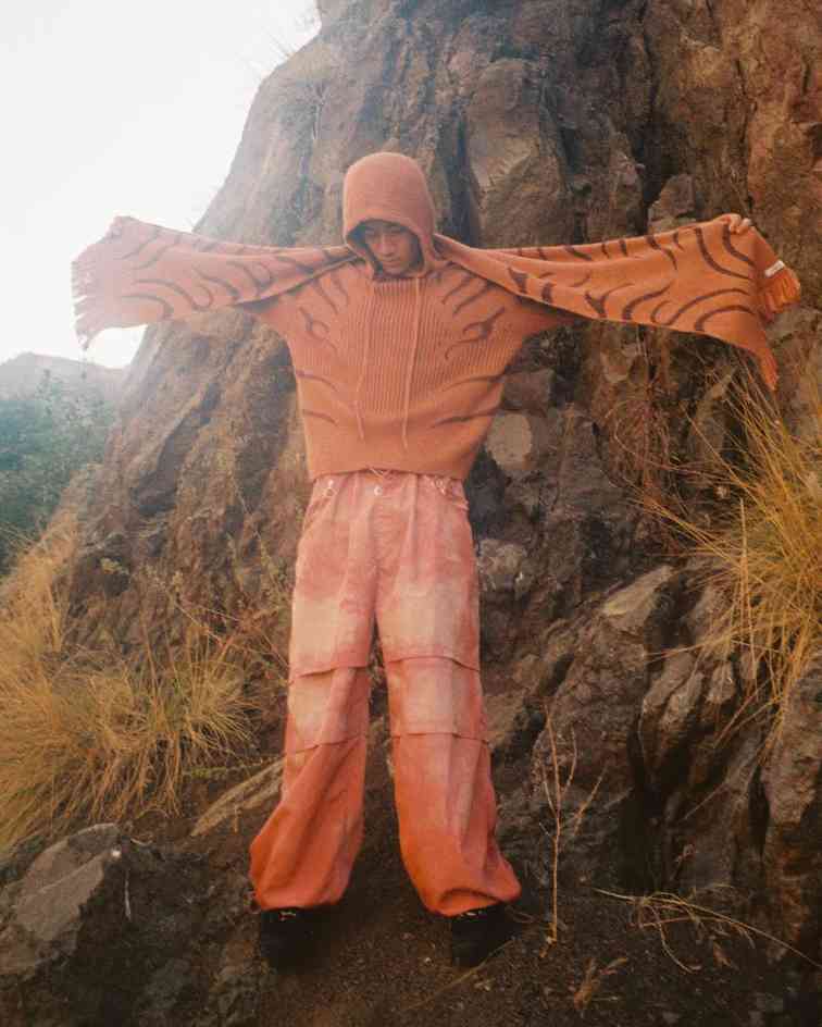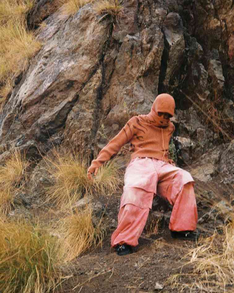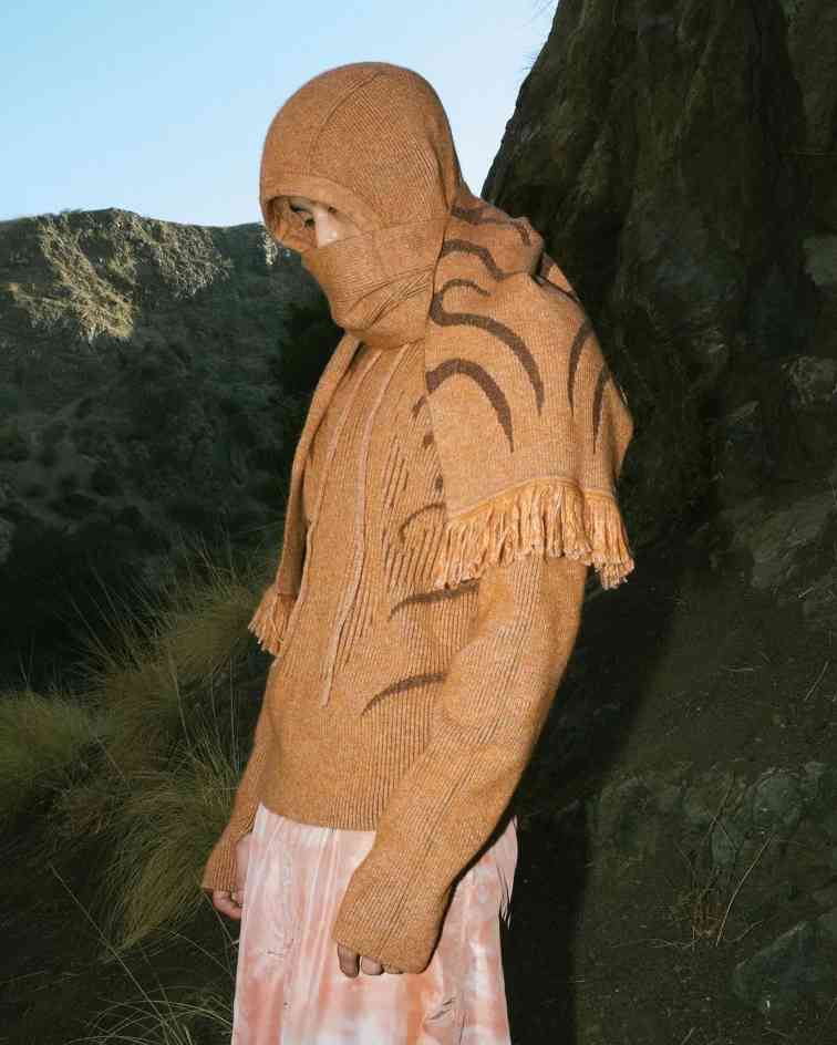 而除了上述两位在先锋意境和简约质感中反复拿捏平衡的代表,当下的户外时尚针织品诠释流派中,也有着像 Charlie Constantinou 这样极致视觉系的个性玩家。