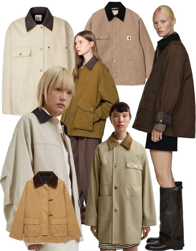 剪裁通常是宽松利落的直筒廓形,方便穿着者在工作时便于伸展肢体。多选用耐磨耐用且功能性强的面料,比如棉帆布和蜡质棉。如果有保暖需求的款式还会增加使用法兰绒或羊毛材质以及绗缝设计的加棉内衬。
