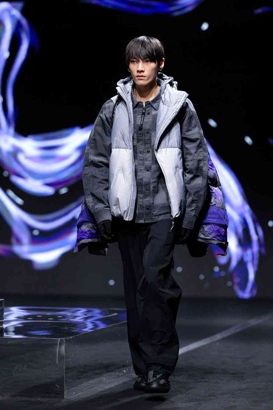 另一件 2in1 设计的「新机解构者」机能服饰,单从秀场 Look 就能感受到该单品的层次叠穿魅力。这种视觉层次感在设计与功能性中皆有体现,设计上,通过不同色系的防钻绒胆布结合外层面料的透色效果,达到深浅不一的同色系变化呈现;而所谓的「2in1」,即该单品可拆卸出「羽绒马甲」和「羽绒夹克」,自由组合,适合不同气候和场景需求穿着。