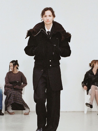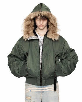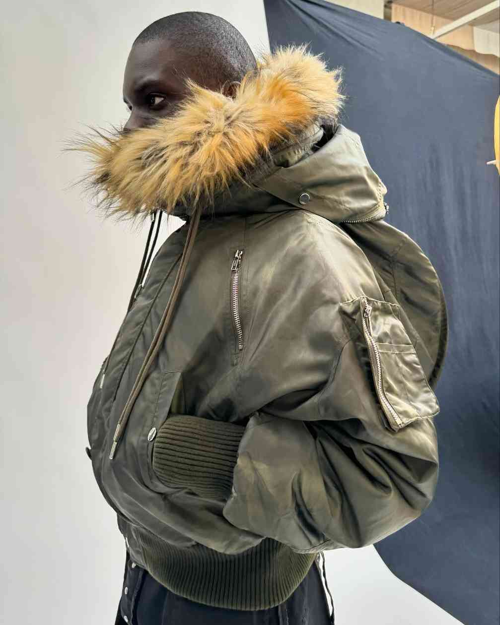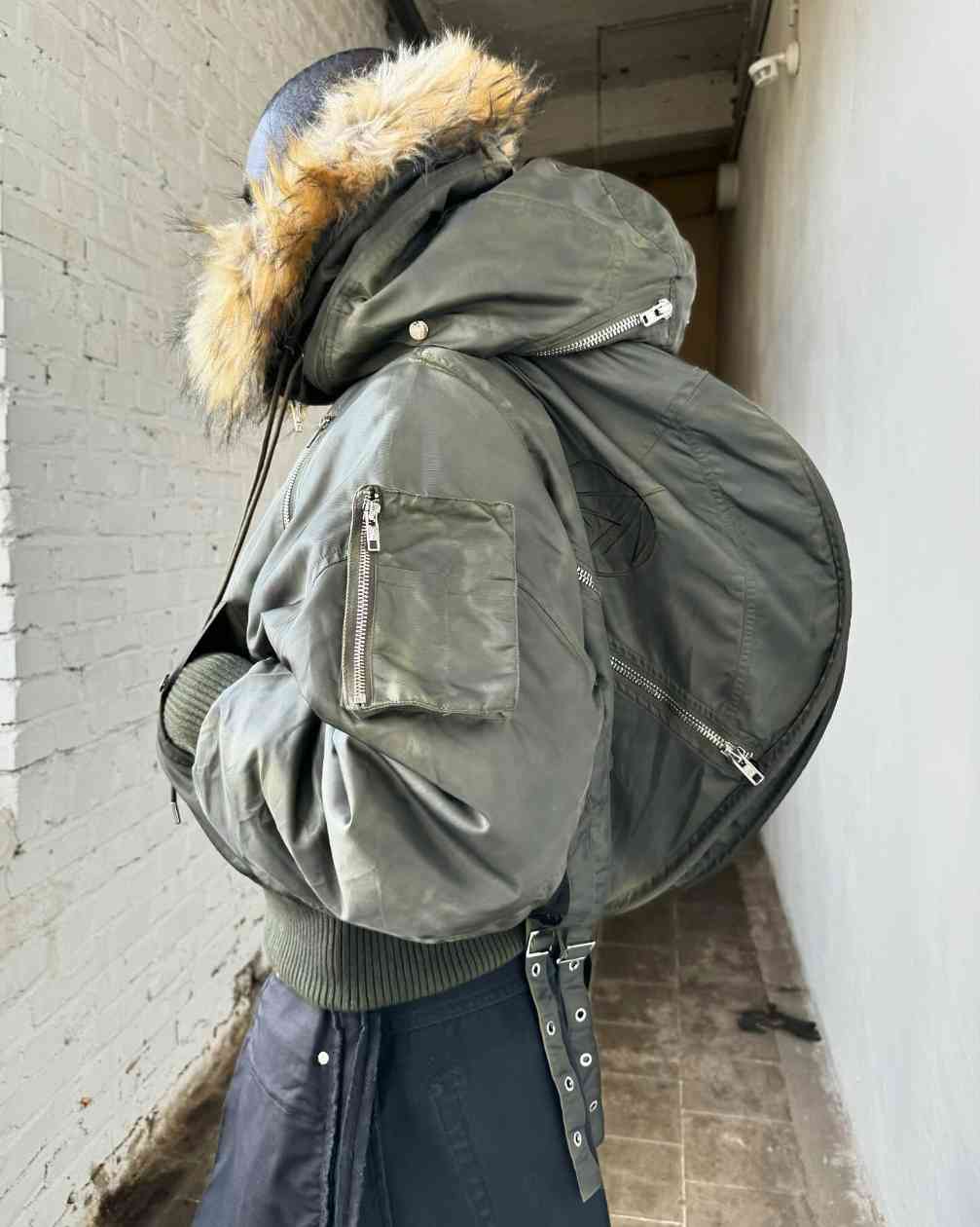 夹克整体采用深橄榄绿色调,展现出强烈的复古军事气质,同时又注入了当代设计感。面料选用厚实的尼龙材质,确保在冬穿着的保暖性能。一大亮点无疑是背部的夸张拼接与拉链细节,融入了多层弧形剪裁与金属拉链装饰,形成了独特的立体构造,为外观增添了强烈的未来感,营造服装的动态美学。