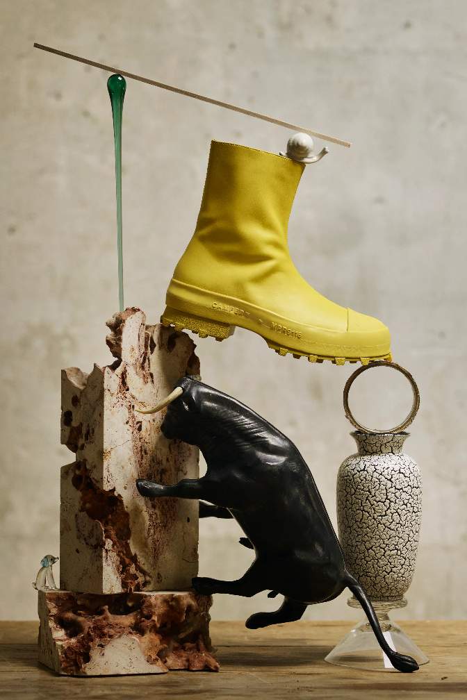 这种不断进阶的风格进化,为 CAMPERLAB「爆款制造机」的作品推新持续提供势能,也自此正式让其走向完全区别于过往的美学新走向。当然,这些看似就像随机跳进 Achilles 脑中的「玩世不恭」时尚观,不光只在 CAMPERLAB 的风格营地中展露,更在不同的发散领域得以体现。