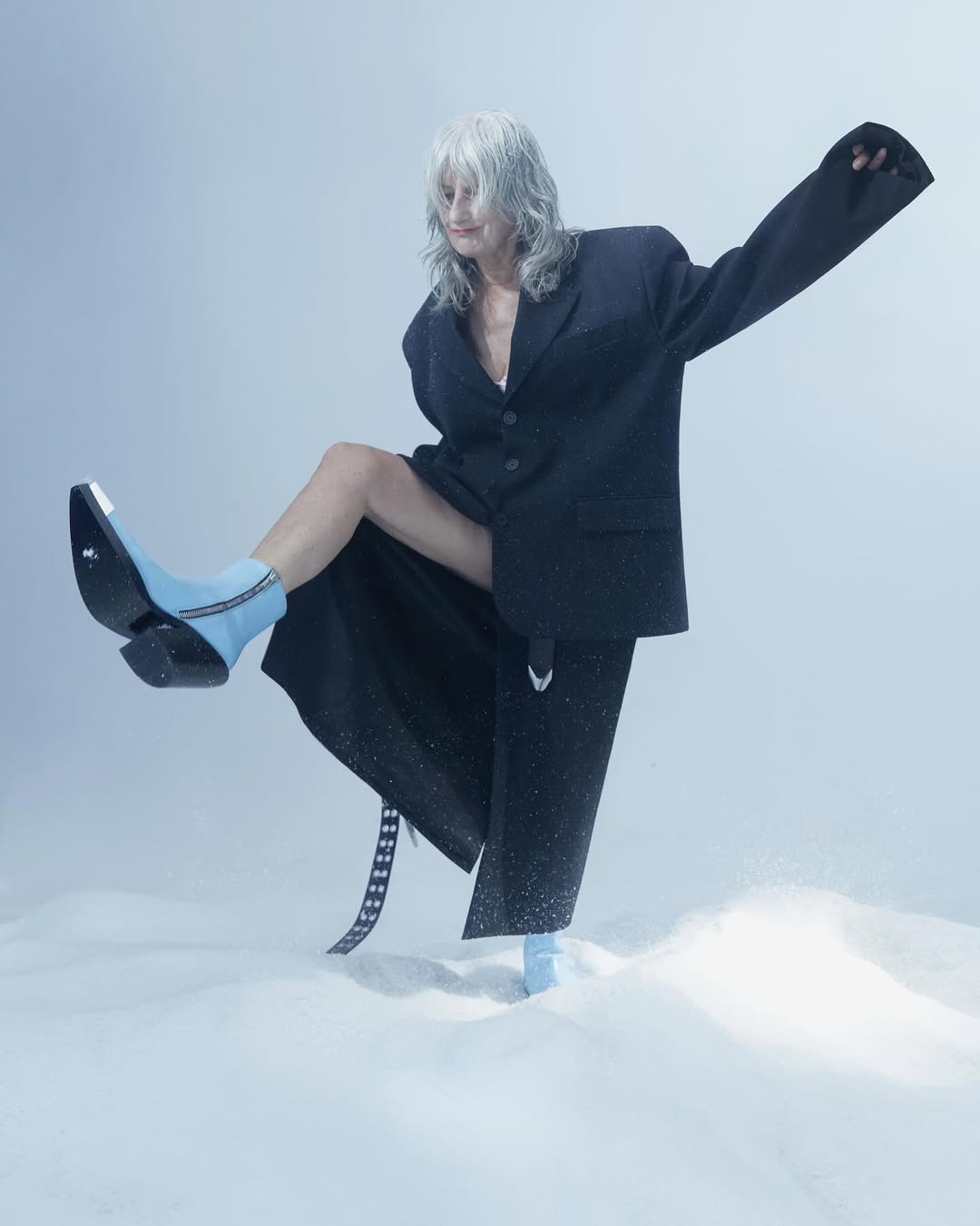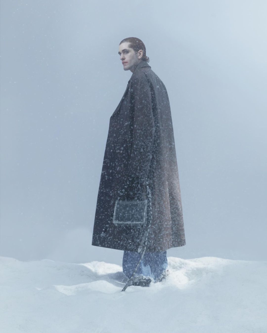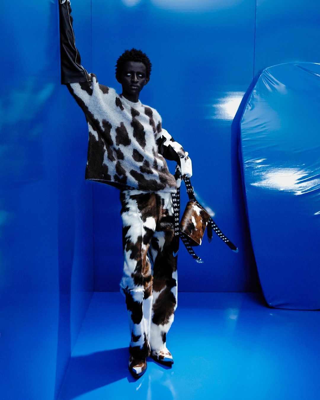 与素白的冰天雪地形成鲜明对比的蓝色调氛围、奶牛长毛、超大廓形打造的立体感视觉,以及印有脏袜、赤脚图像的铁头靴…相比 CAMPERLAB 有过之而无不及的色彩玩转和猎奇画风,在 Achilles Ion Gabriel 个人品牌中更「肆无忌惮」地凸显。
