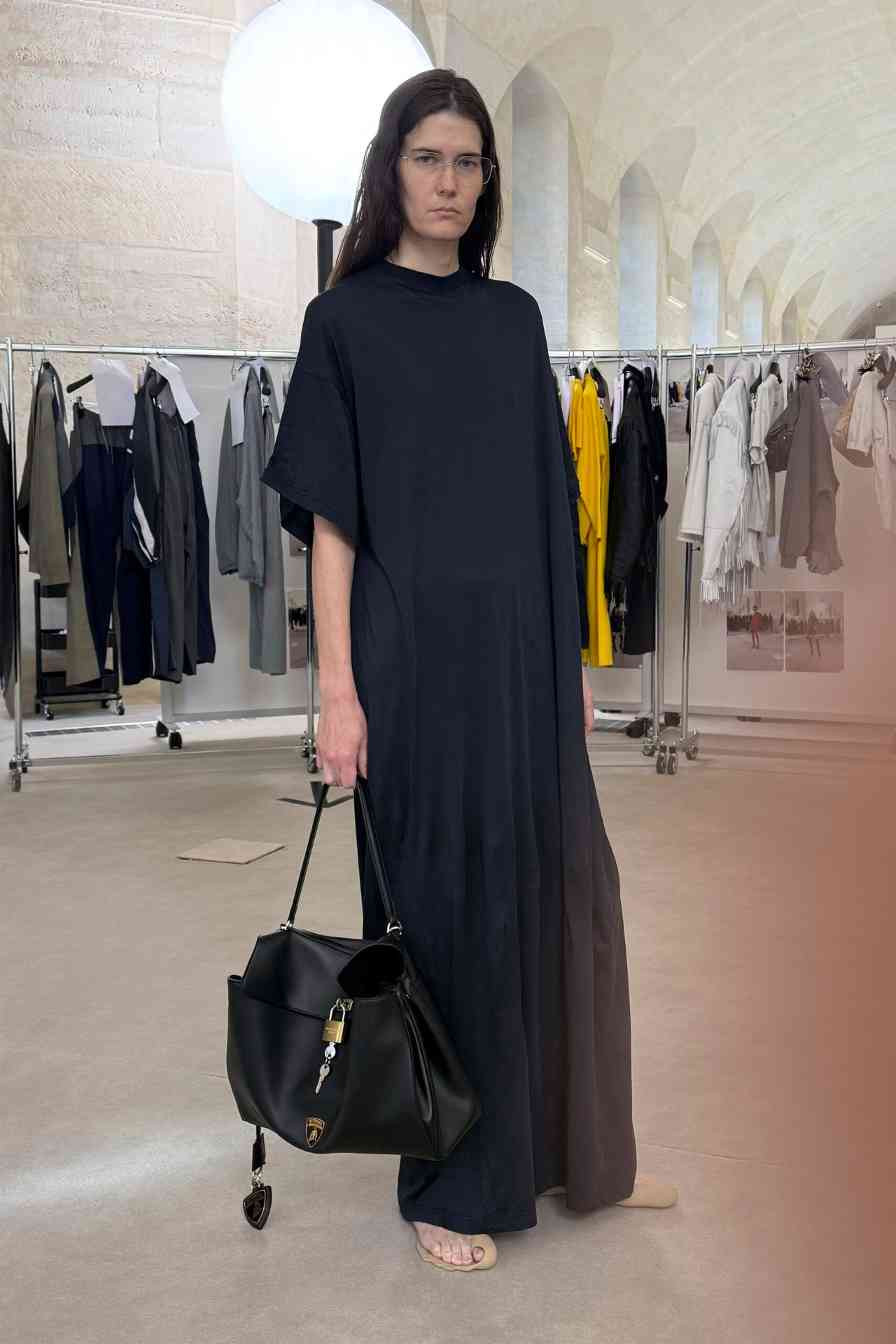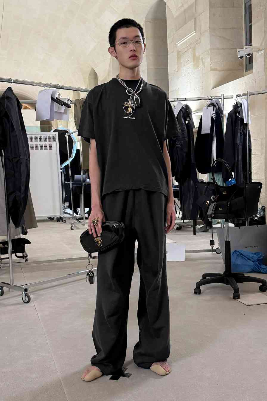 而 BALENCIAGA 一贯为人所津津乐道的「噱头」营造同样没有落下:首套造型与最后一套遥相呼应,虽均是围绕 T 恤这一基础版型进行诠释,前者是通过针织材料以及巨大、流畅的廓形设计,还原 Cristóbal Balenciaga 手下经典的茧形轮廓,后者则是被重塑成了紧身迷你连衣裙;与此前超大鞋款形成鲜明对比,有着极致精简设计的 Zero 鞋款首度登场;还有将众多经典长款服饰,去除袖笼结构后转换成围巾的设计,以及目前流量最为集中的兰博基尼合作系列。