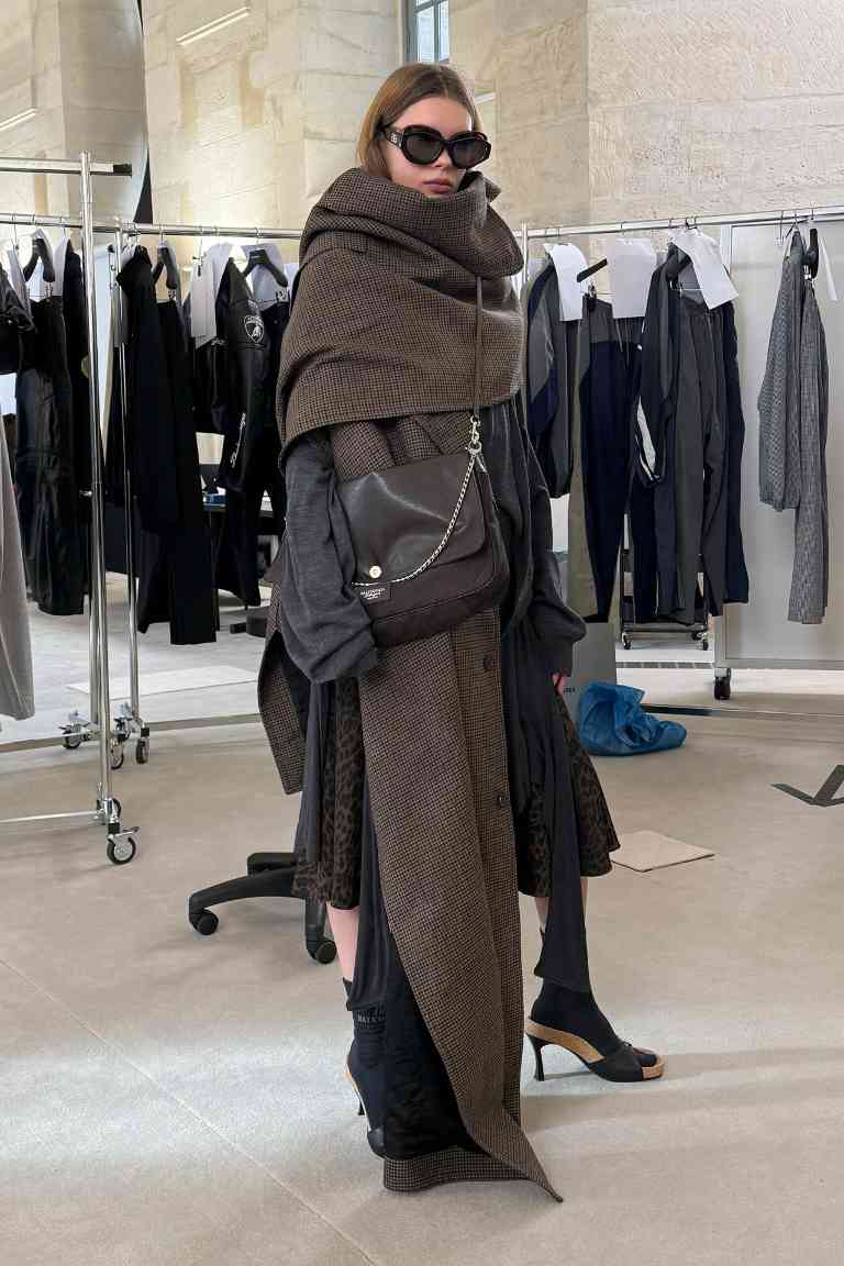 将长款服饰转换成围巾的设计,右图模特穿着 Scholl 合作款高跟鞋 | Via BALENCIAGA