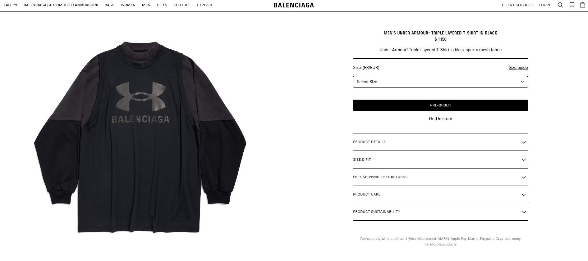 根据官网显示的信息,首发长袖限量 630 件,用以「庆祝双方对尖端创新的共同承诺,将汽车美学与品牌元素融为一体」。因此在全球知名高端汽车厂商合作,首发限量单品等多重 Buff 的加持下,这件单品的售价也趁此水涨船高一波显得好像是「理所当然」。略显吊诡的是,这件单品的价格在 BALENCIAGA 的定价体系中甚至称得上是「底价」,售价为 850 美金。与之对应的同类型长袖 T 恤单品,BALENCIAGA 自身产品定价在 1,000 美金左右,UNDER ARMOUR 合作长袖去到了 1,150 美金。
