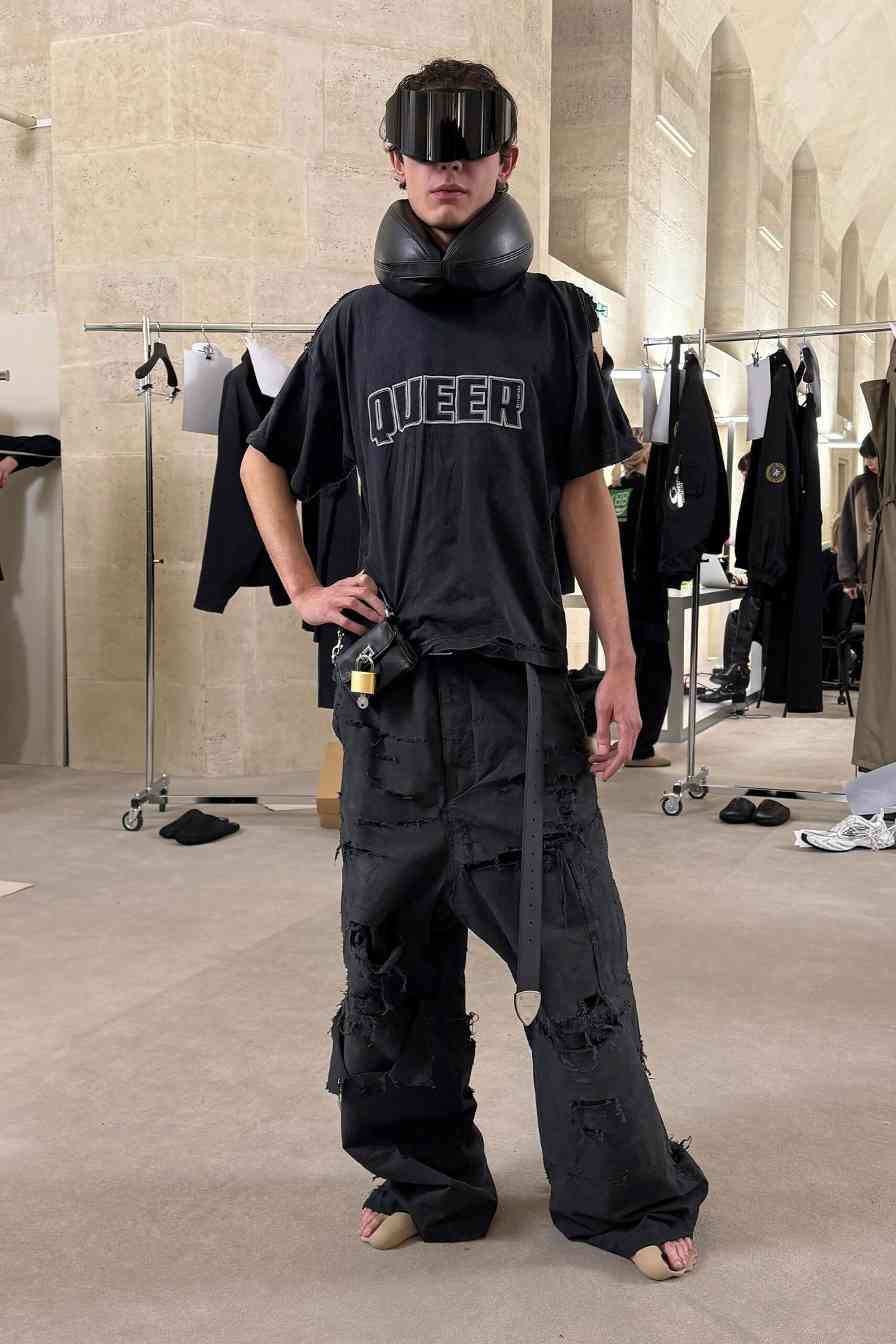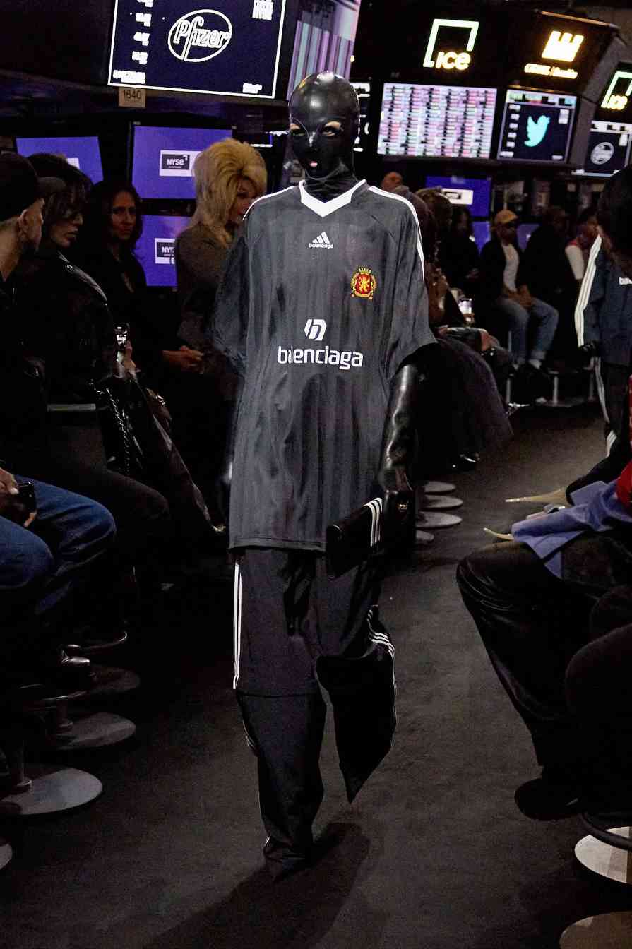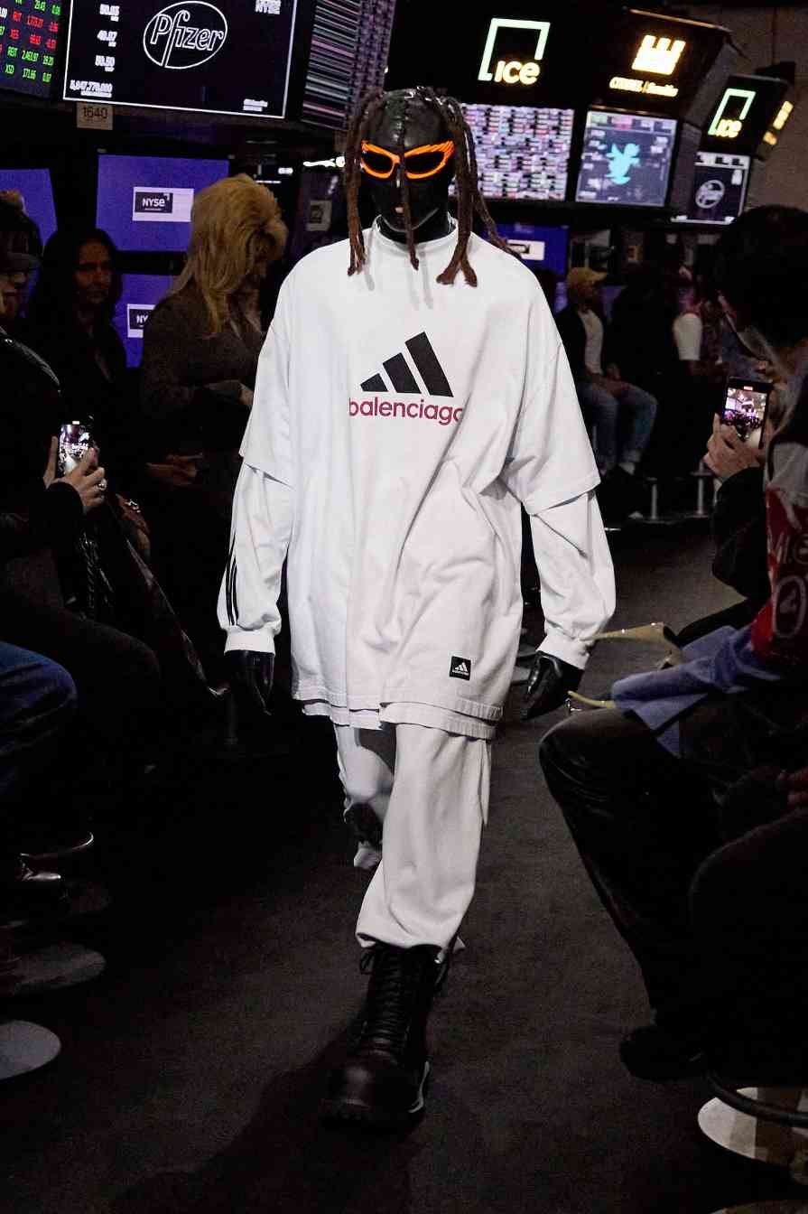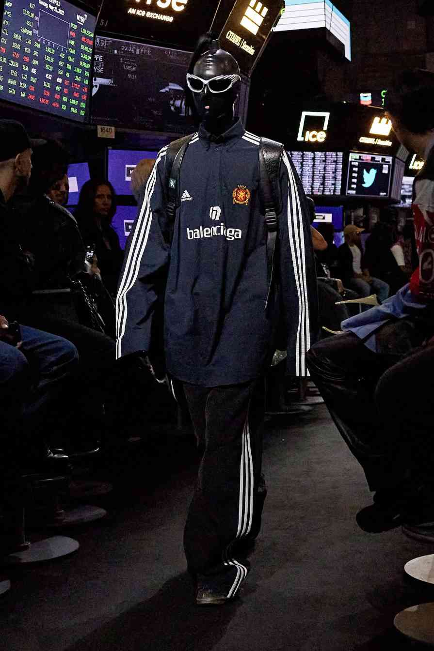 以上还有一个听上去很像悖论的关键点:Demna 是在将他所讽刺的行为推向极致,以达成讽刺的效果。事实上,Demna 早已不是第一次把这种「强盗逻辑」展现给全世界的时装爱好者。此前的 2023 早春系列秀场,便是赋予 adidas 难以理解的高价,用极端消费主义行为反击消费主义的做法。