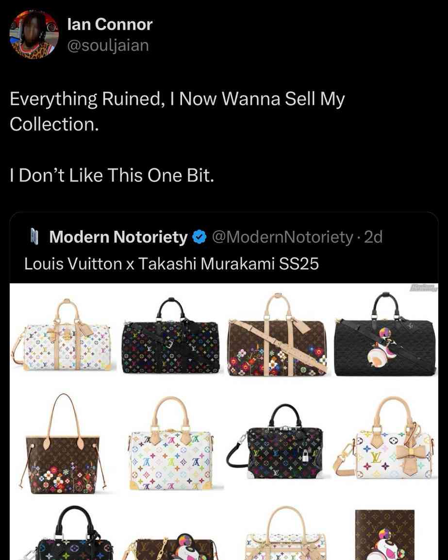 LOUIS VUITTON 将这次合作回归定义为「re-edition」系列,所以在单品设计上并不会有初次亮相时那般颠覆,也就直接导致该系列在部分「已经拥有」的玩家心中变成一个「没那么稀有」的存在。就如 Ian Connor 的发言更是引发了潮流圈的讨论。作为潮流文化的领军人物之一,他的失望态度直接反映了对当下品牌和艺术家创意能力的质疑。