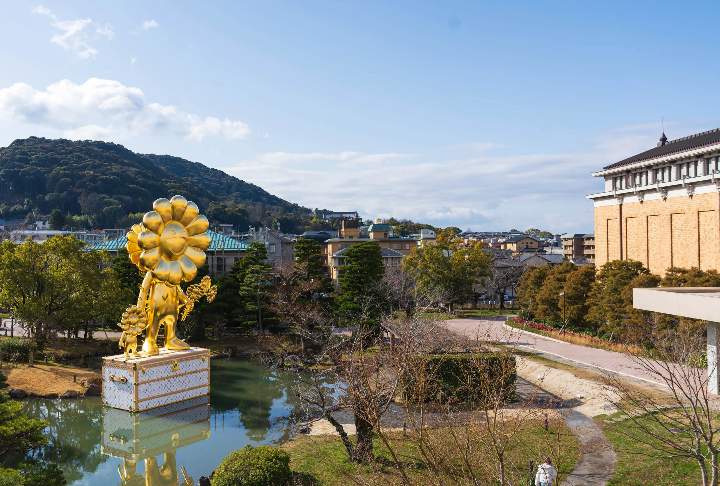 京瓷美术馆外村上隆的作品「Flower Family」和 LOUIS VUITTON 旅行箱| Via Fashion Snap