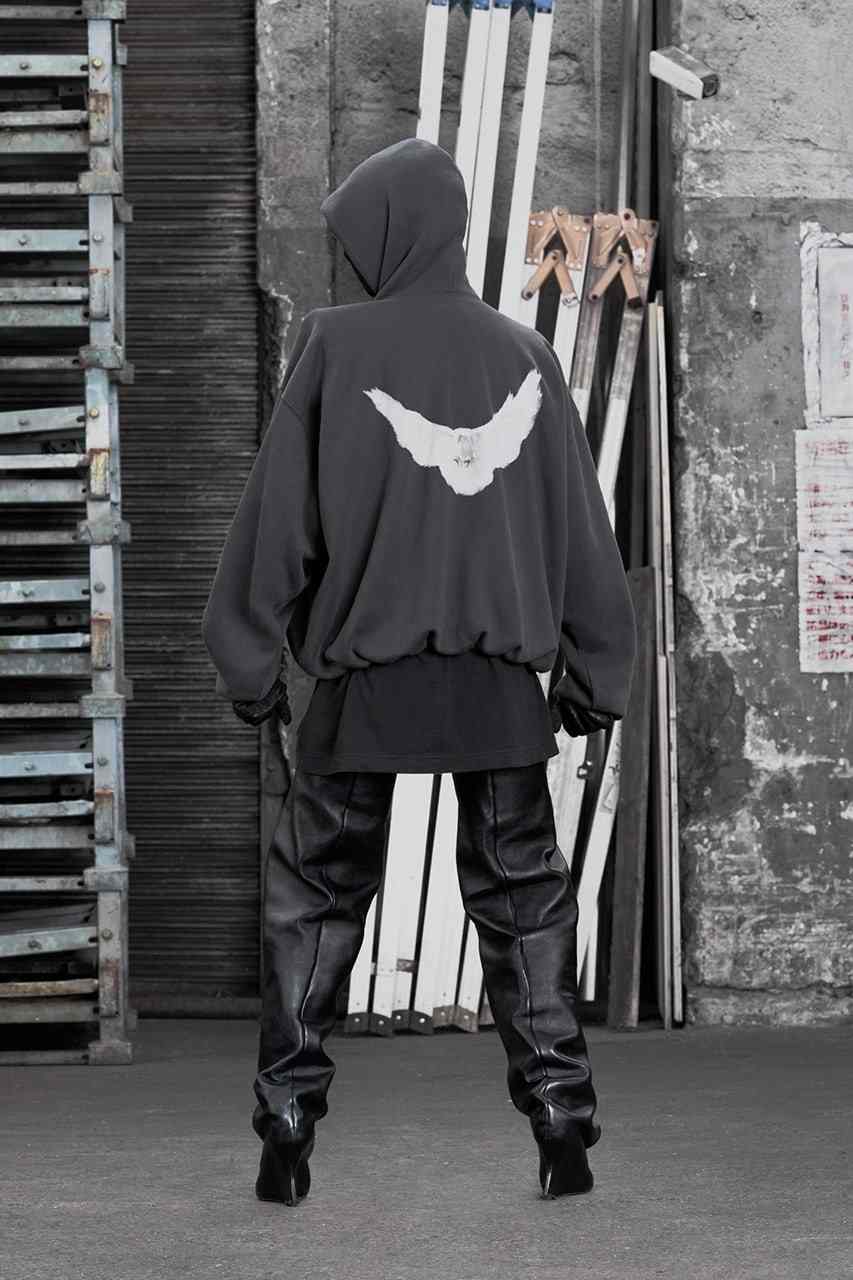 Demna、Gosha Rubchinskiy 和 Lotta Volkova 作为一段时间内前苏联审美和东欧青年文化的代表人物,与 Ye 近年来都保持密切的联系。彼时正值街头文化如日中天的背景,穿插着低俗妩媚的反叛、激进与堕落的东欧青年亚文化被这三位东欧血统的创意先锋搬上秀场,在当时对行业带来的影响可以用颠覆来形容,所以从曾经的 YEEZY SEASON 到昙花一现的 YZY GAP,再到《VULTURES》周边和当下 20 美金理念的 YEEZY 的背后都有这三位出身东欧的创意先锋的身影,前苏联审美、东欧工人阶级青年文化也成为贯穿 Ye 近年时尚生涯的关键词之一,譬如夸张的短宽廓形、西里尔字母印花元素、上世纪 80~90 年代的 Tracksuit 等等。