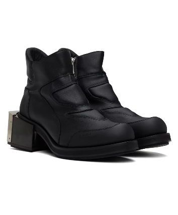 依然是经典的坡跟结构,但却被 GmbH 用硕大的金属块方跟设计,作出了破格性的画风演进;糅合了类似机车靴护板的立体鞋面模块,将运动感与先锋时装理念作出了大胆杂交诠释。