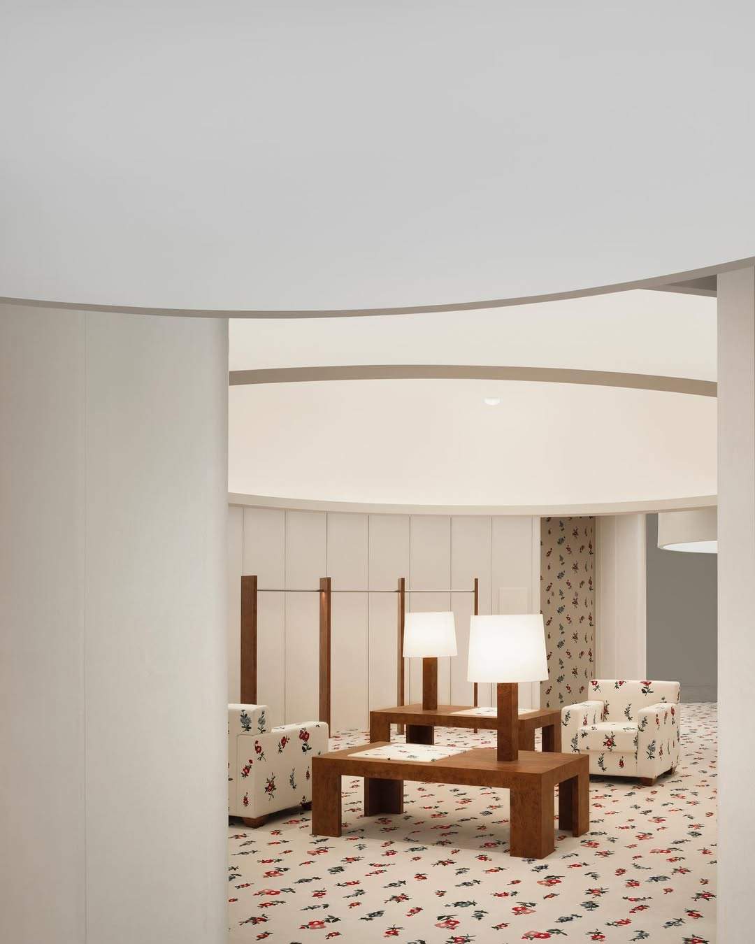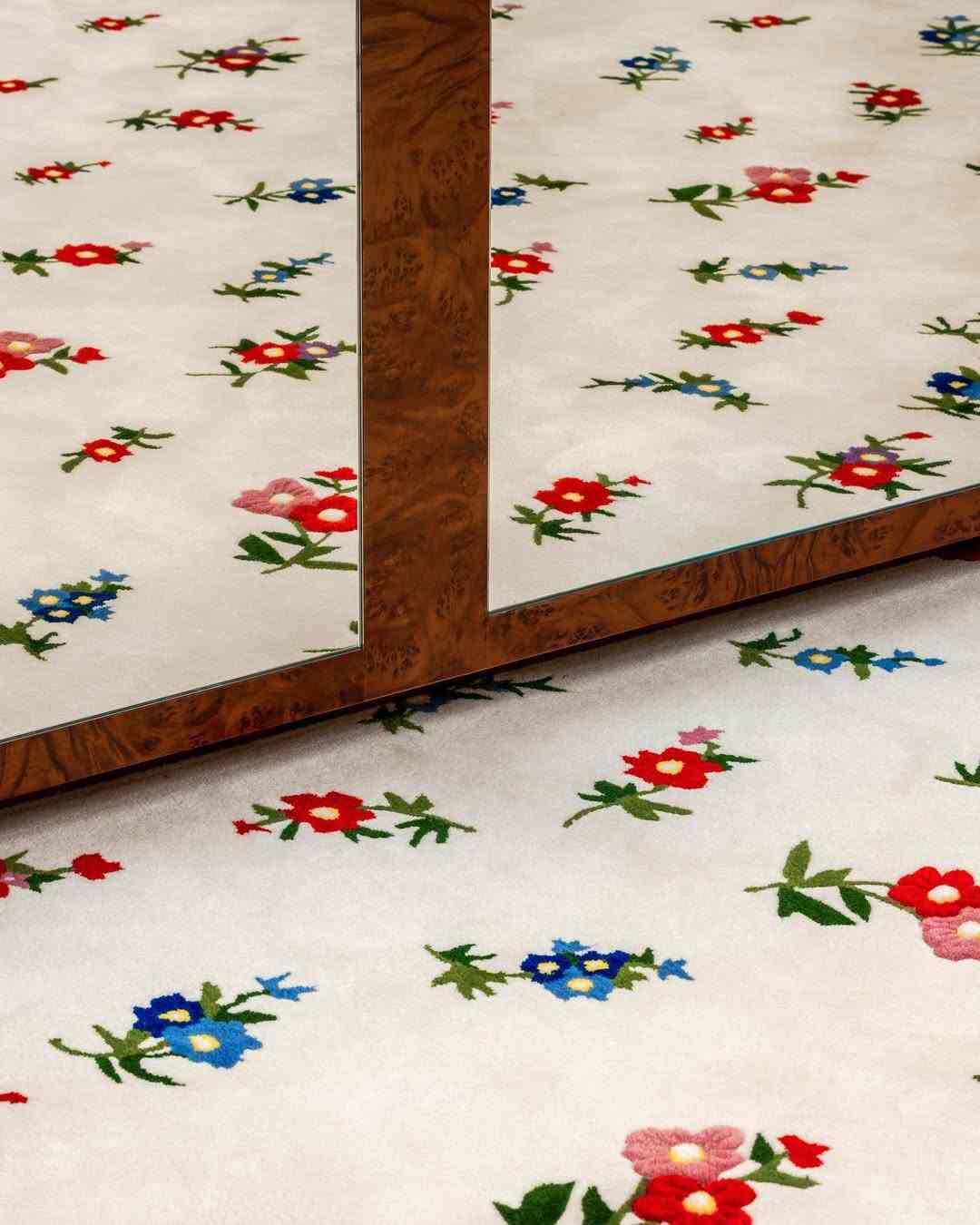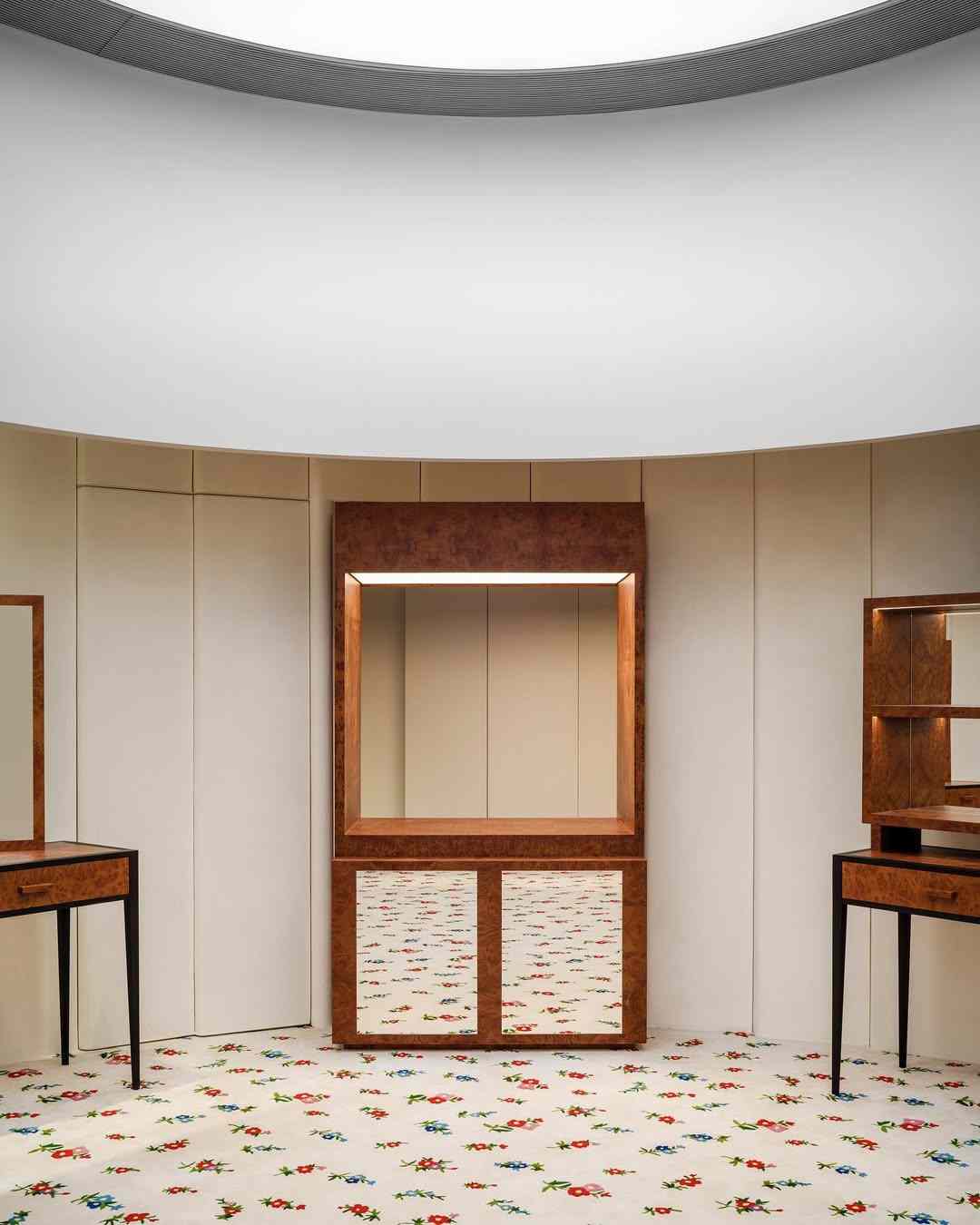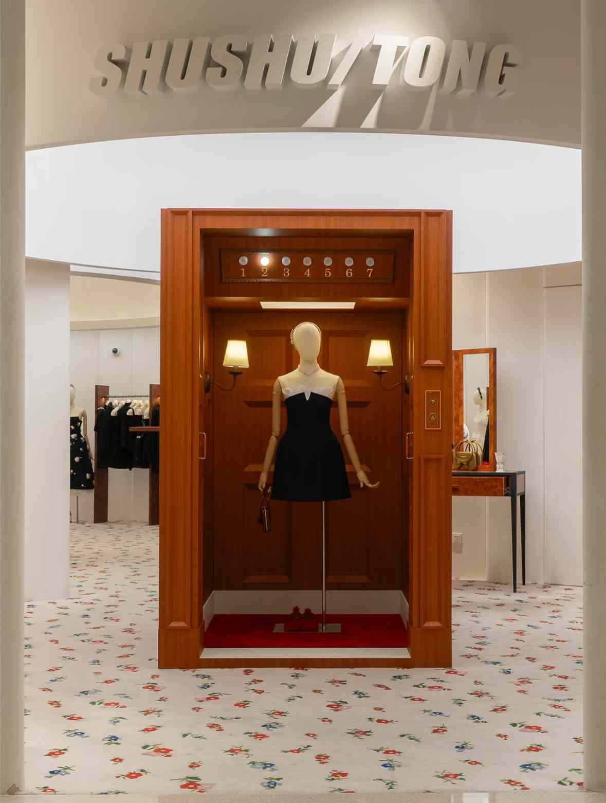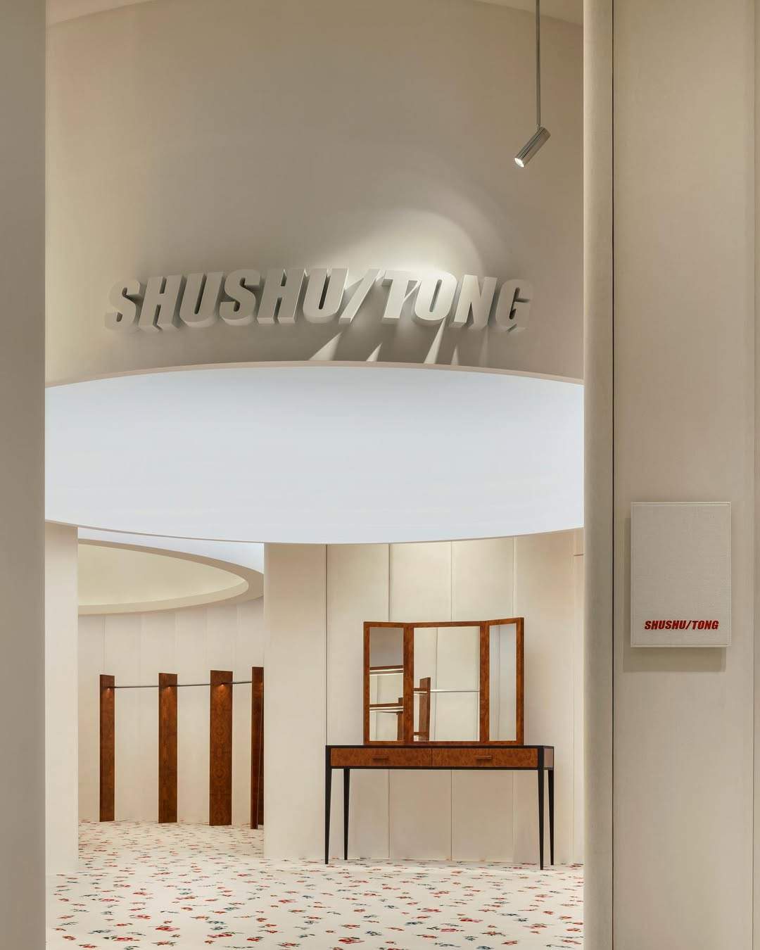 SHUSHU/TONG 的上海店铺位于南京西路的锦沧文华广场,店铺内整体以清新奶油色和米白色为主色调,店内的碎花图案地毯搭配刺绣印花沙发等装饰艺术风格家具,在加上入口处的定制复古梳妆台等布置,仿佛置身少女闺房之中。