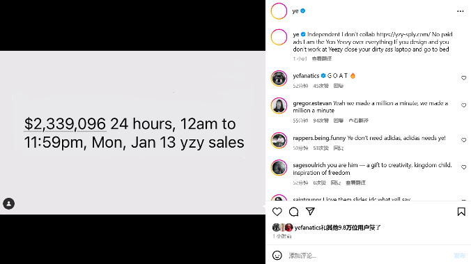 这场风波正式开始涌动之后,Ye 最大的动作就是上架了 YEEZY SLPRS 鞋款以及主动释出 BL-01 图片,不难看出在 Ye 的视角中,鞋履产品依旧是 YEEZY 与 adidas 进行正面「碰撞」的主要赛道。