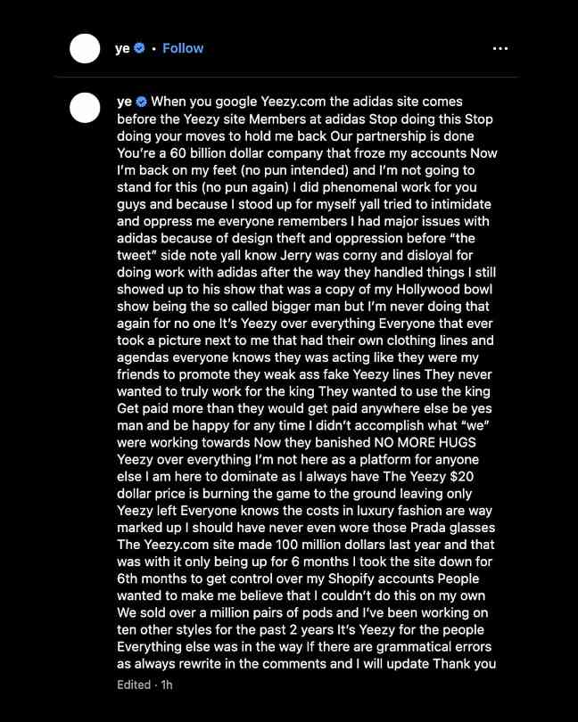 Ye 最初发布的炮轰长文 | Via Instagram @ye