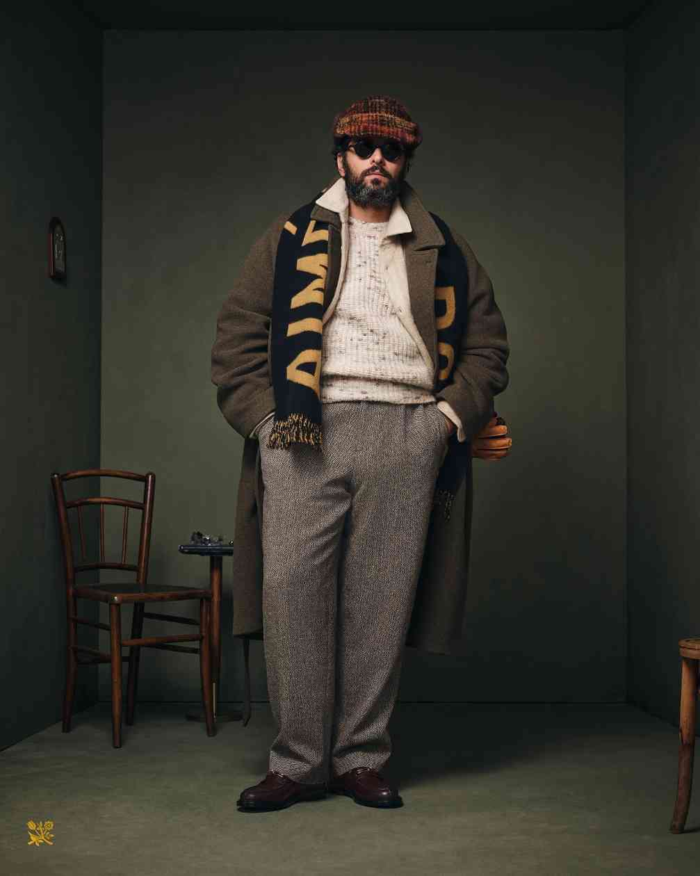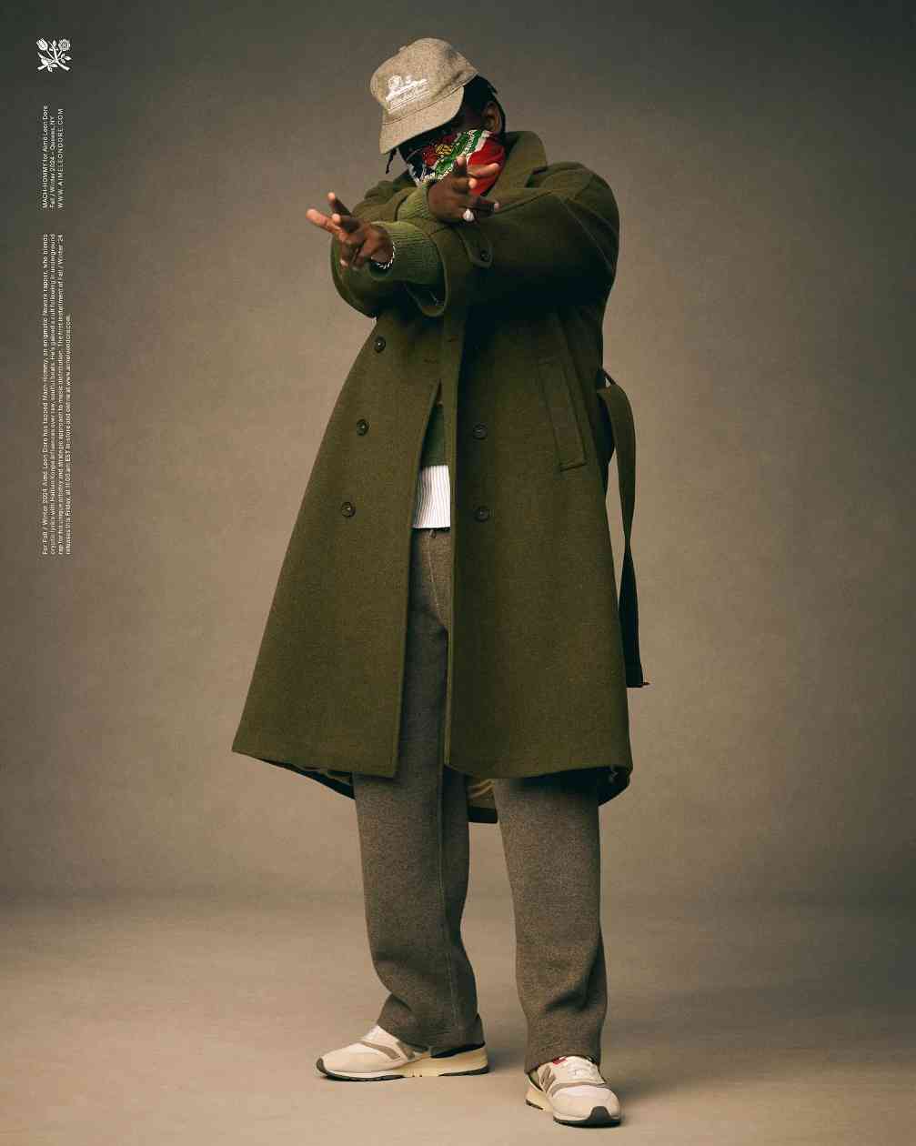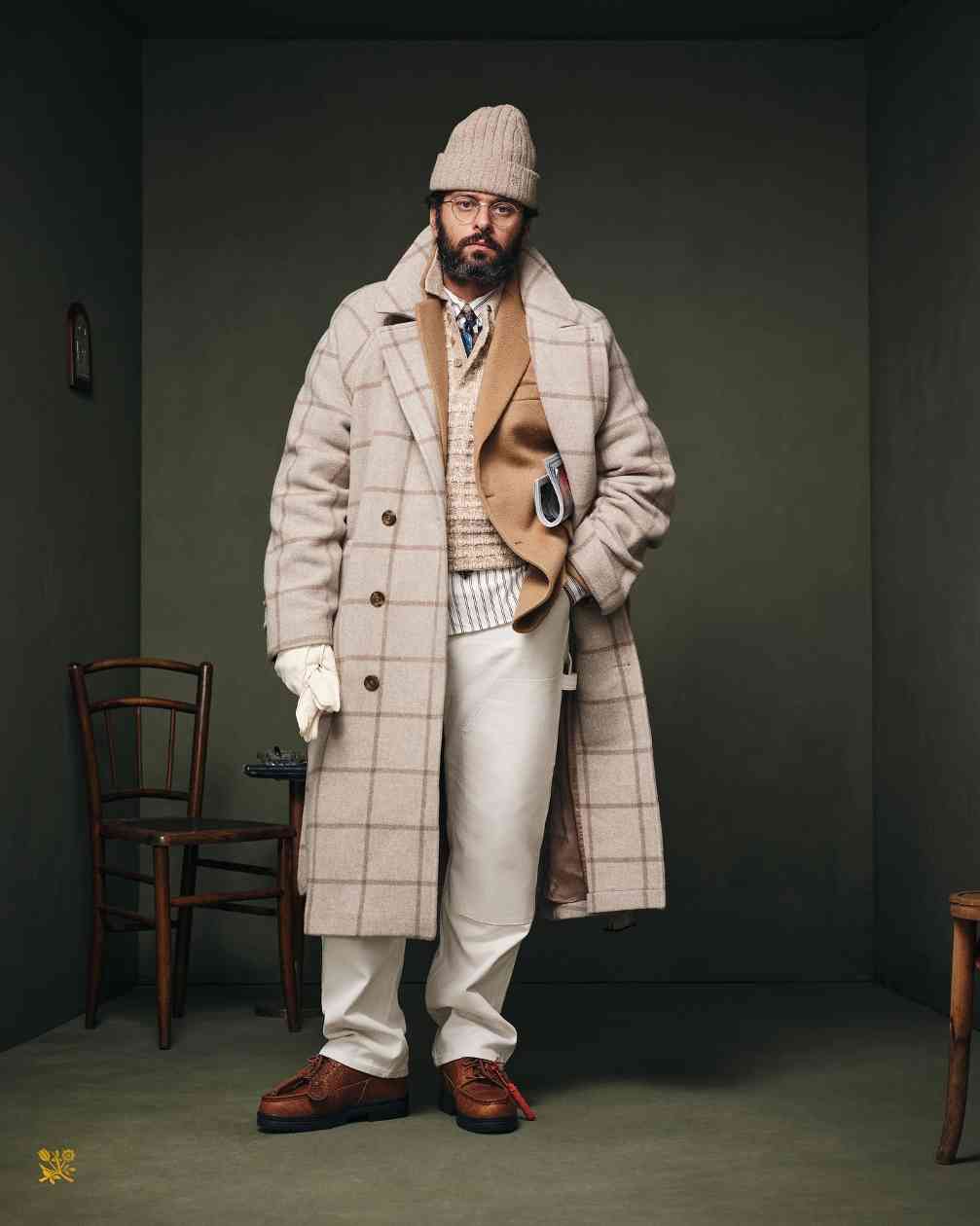 同时基于驳领与翻领复古大衣营造出的混搭造型被 Aimé Leon Dore 开拓出了更多慵懒精致的思路,在不久前邀来 Mach-Hommy 和 Davide Baroncini 出镜演绎的 2024 F/W 造型特辑中,重磅羊绒羊毛面料带来的挺括垂坠感配合 Double-knee 工装裤以及格纹长裤带来可玩性极高的雅痞层次感,这种对上世纪 70~80 年代北美着装风貌的二次诠释成功打造出游离于流行趋势之外的审美体系,甚至影响了当下很多品牌的设计趋向。