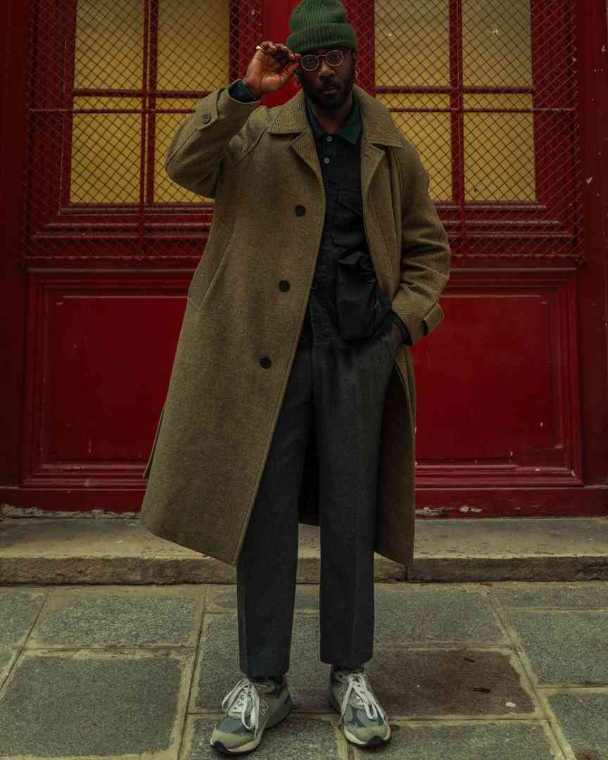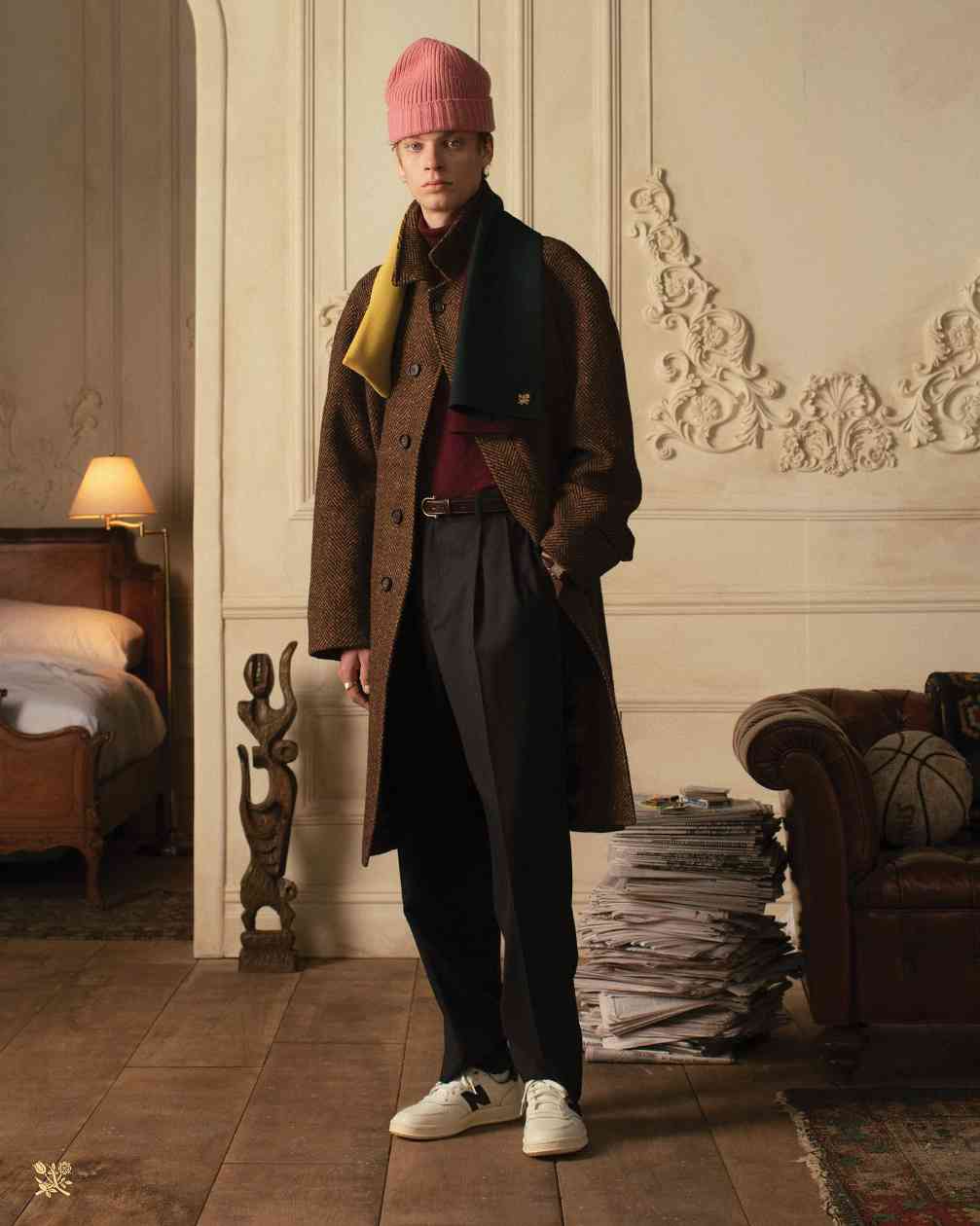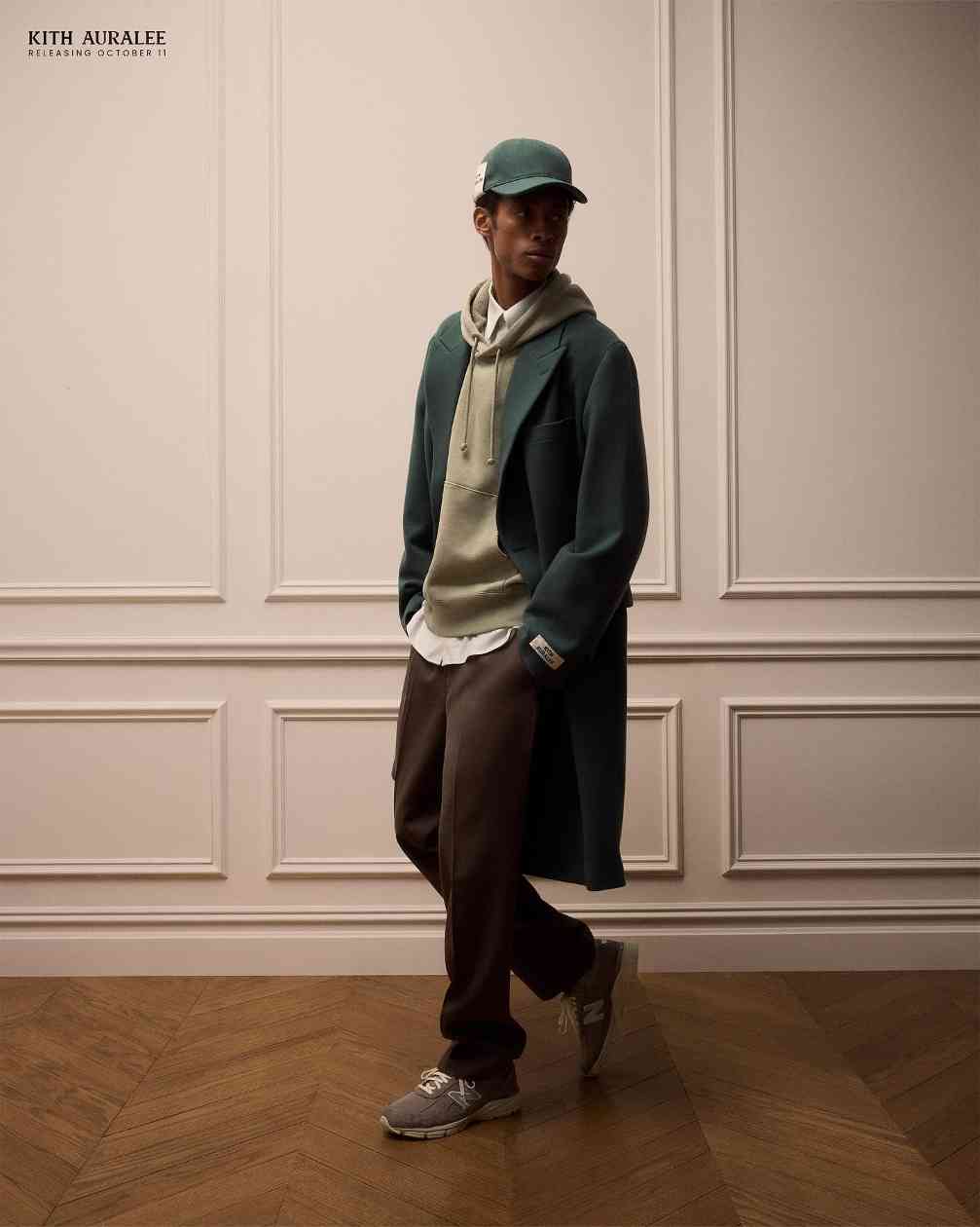其实早在前两年 Aimé Leon Dore 与 New Balance 的合作系列型录中,驳领大衣与翻领大衣就成为贯穿整个合作系列的核心造型单品,其中驳领大衣+卫衣+运动卫裤配合年迈的素人模特演绎下成功烘托出全新的复古审美氛围,也是 Aimé Leon Dore 成功破圈的重要时尚线索。