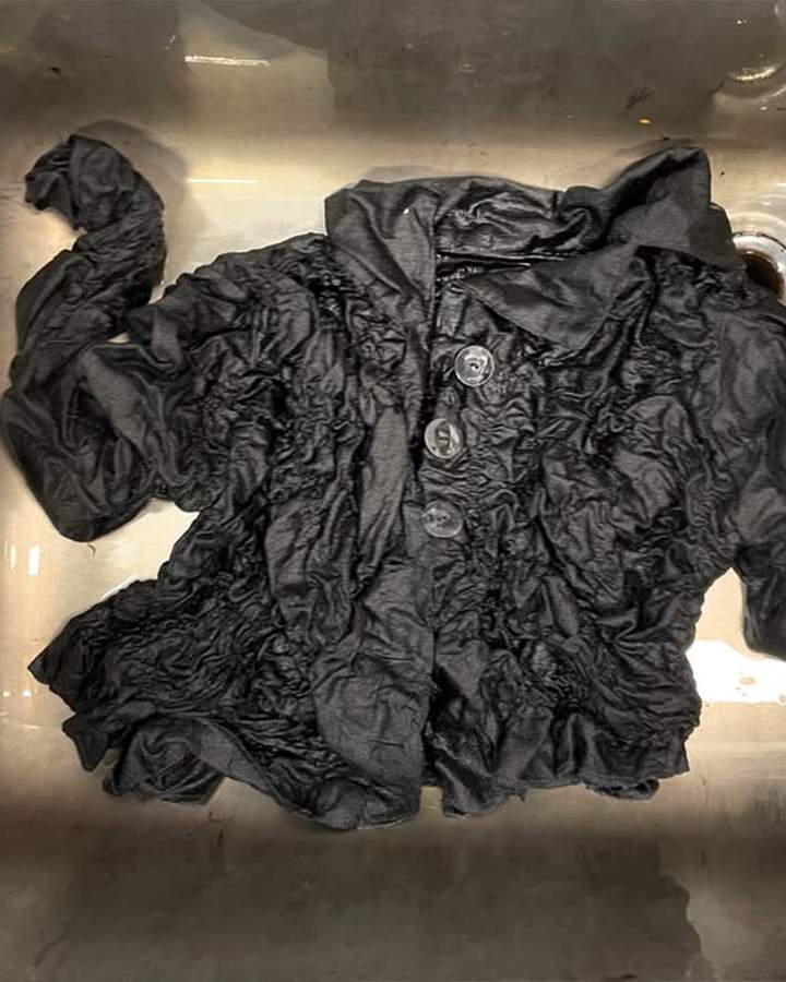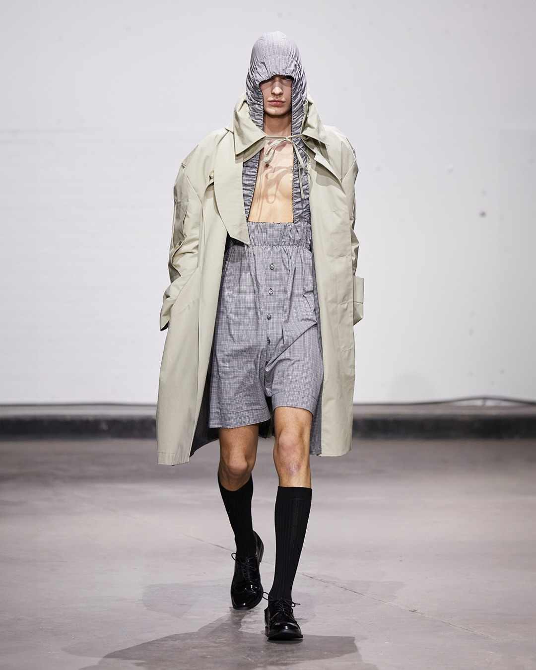 另外,在材质的选择也具有深刻的象征意义,例如经典的羊毛和花呢与蜡棉和尼龙的结合,模糊了被动与主动之间的界限,体现出记忆的断裂和时尚的双重性。而立体褶皱效果创造出动画般的动感,褶皱的设计象征着记忆的扭曲,而消失的服装则反映了主题中的羞耻感。