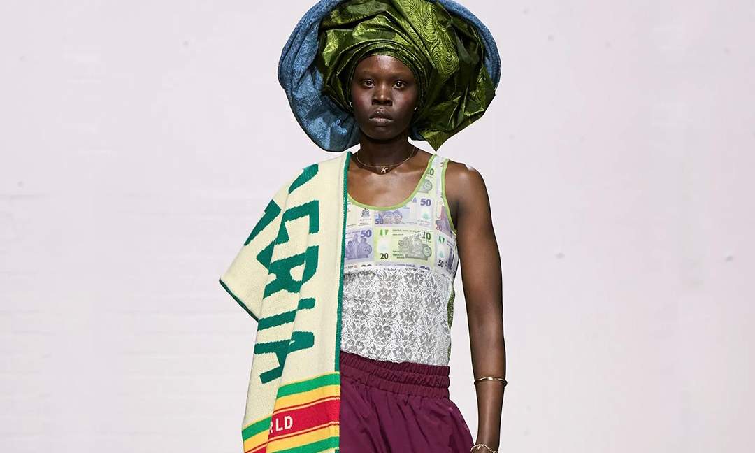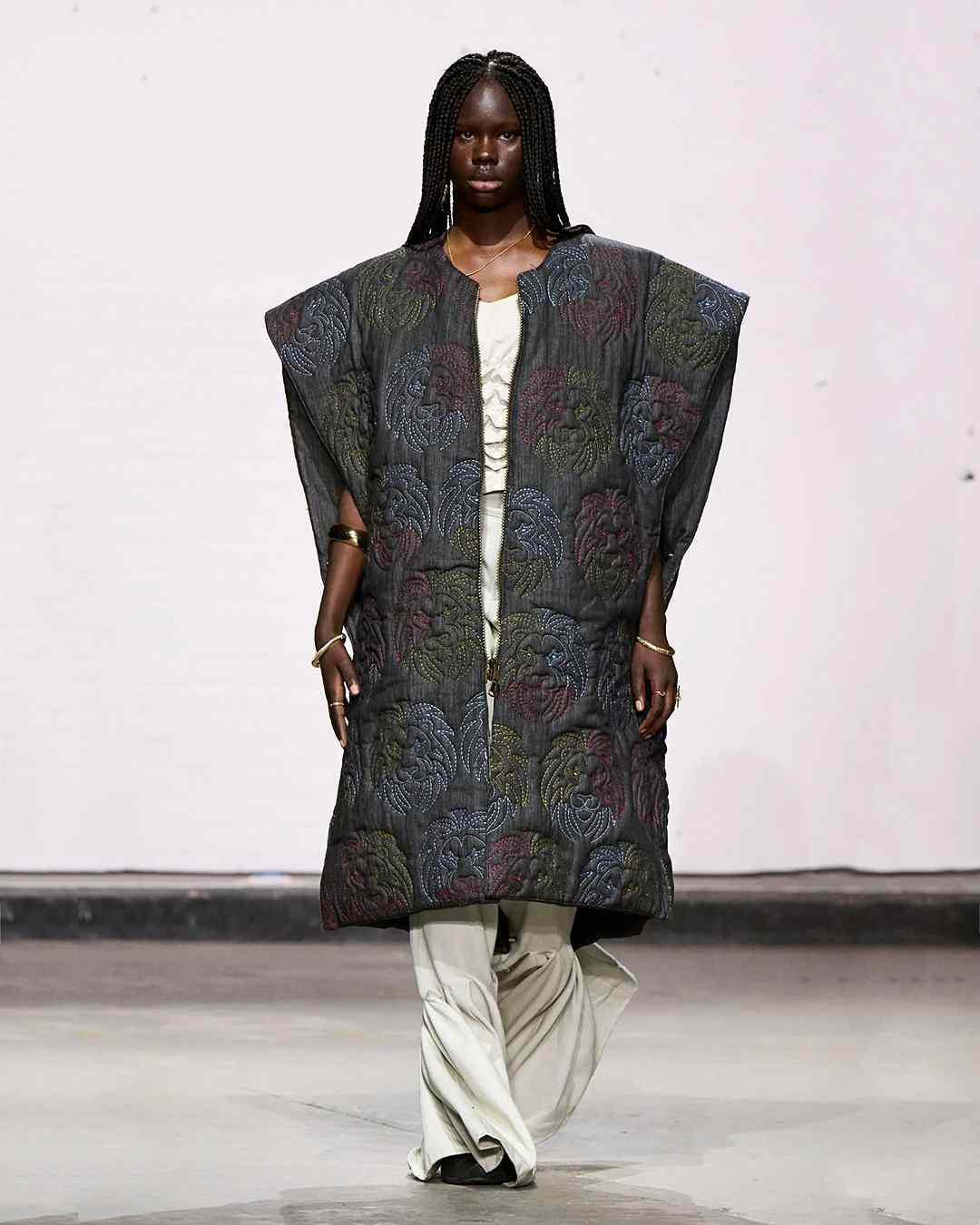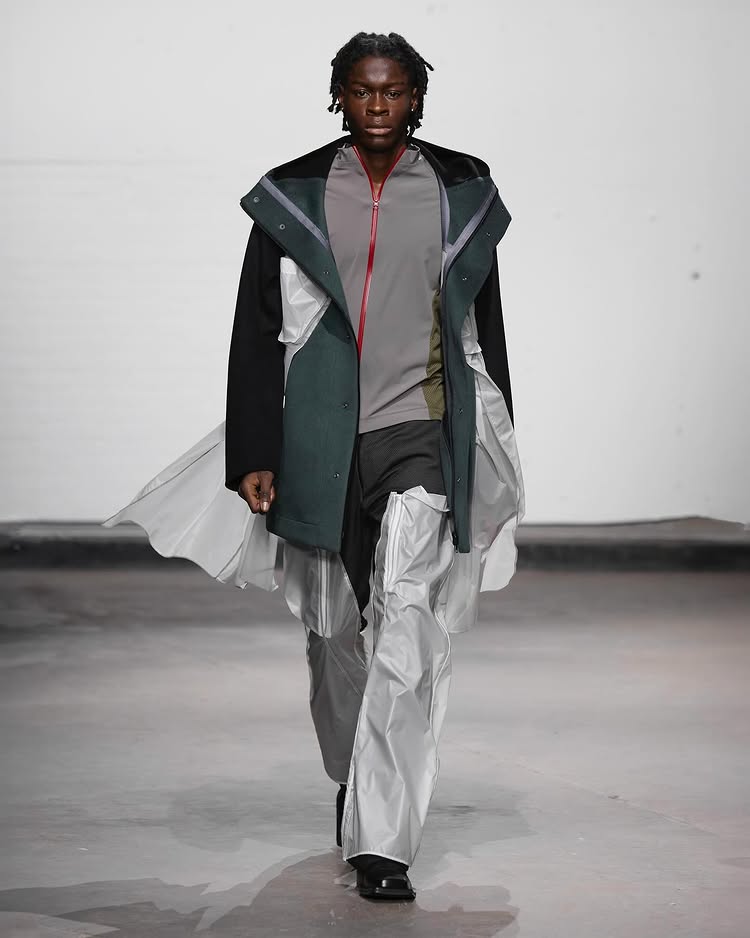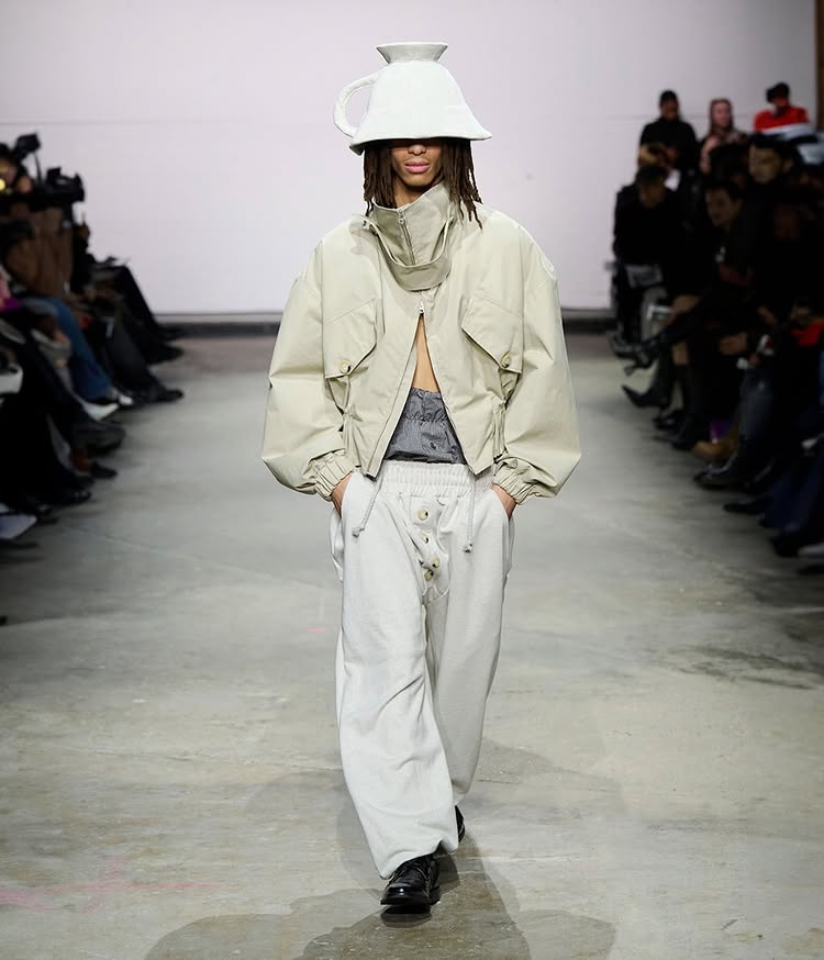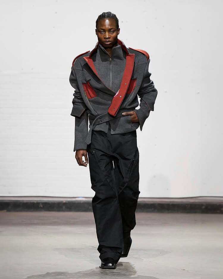 Kelechi Mpamaugo 的系列以「Home and World」命名,灵感源于其美国和尼日利亚血统双重血统,两个世界之间的「文化流动」被巧妙转化为设计元素,呈现出一种和谐的融合。例如传统尼日利亚头饰,以及被切割成西非传统长袍的飞行员夹克等。通过一个个鲜明的设计符合,表达了设计师对全球文化交融的深刻理解。