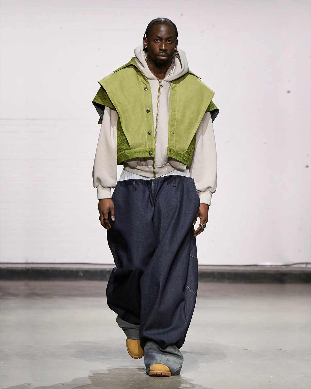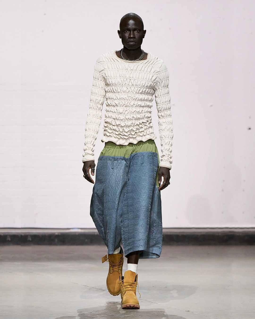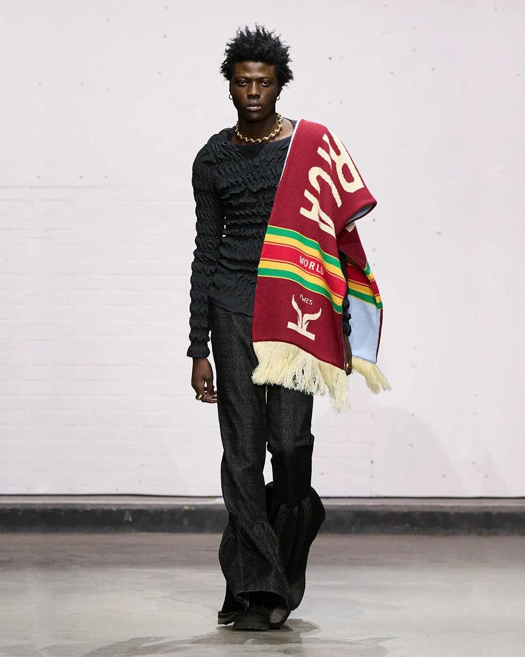 Kelechi Mpamaugo 的系列以「Home and World」命名,灵感源于其美国和尼日利亚血统双重血统,两个世界之间的「文化流动」被巧妙转化为设计元素,呈现出一种和谐的融合。例如传统尼日利亚头饰,以及被切割成西非传统长袍的飞行员夹克等。通过一个个鲜明的设计符合,表达了设计师对全球文化交融的深刻理解。