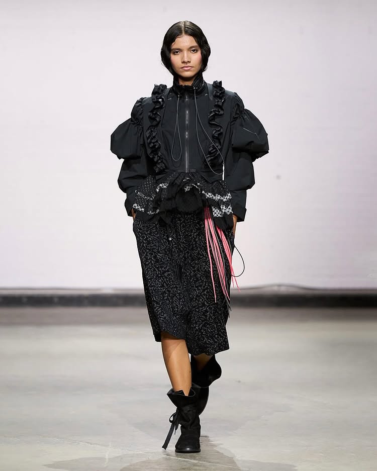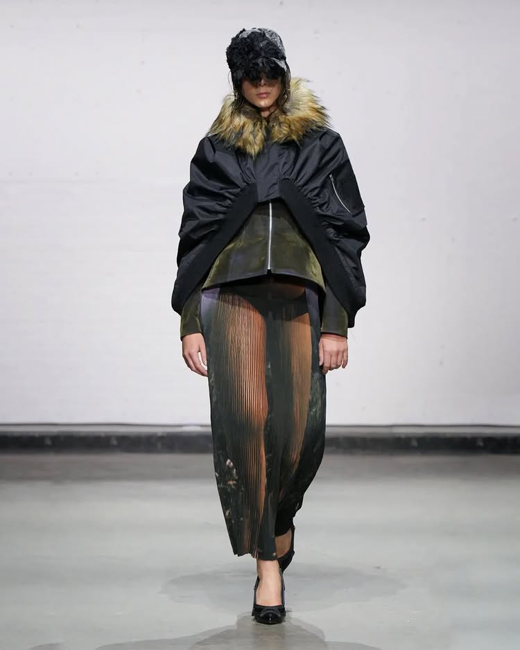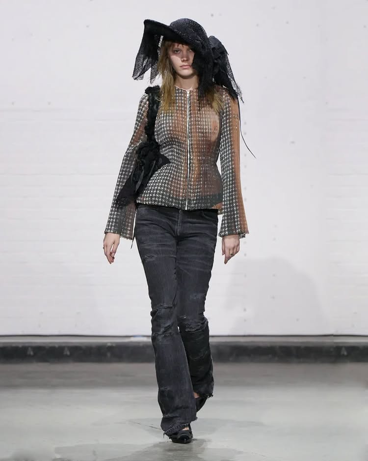 在这次秀中展示的《In Recollection//404》系列中,深入探讨了在当今技术驱动的世界中记忆的脆弱性,并思考了人工智能如何可能扭曲历史,以及时尚对于过去的痴迷如何影响现代设计。设计上参考 1940 和 50 年代的女性服装,尤其是 DIOR 和 CHANEL 的经典设计,更通过运用技术故障和 AI 生成的错误,挑战了传统的纯粹与被动的女性形象。