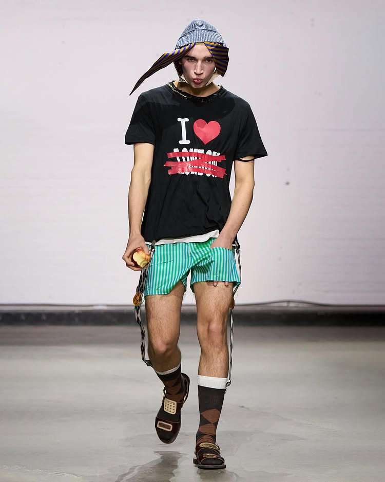 在几套造型中,这些主题得到了鲜明体现。例如,通过宽松卫衣与条纹工装裤的搭配,呈现一种自由与反叛的气息;派对帽、条纹围裙和粉色亮面衬衫,表达了传统与现代的融合;而「I LOVE」字样的 T 恤和五彩短裤搭配,则传递出青春叛逆和自我表达的力量。
