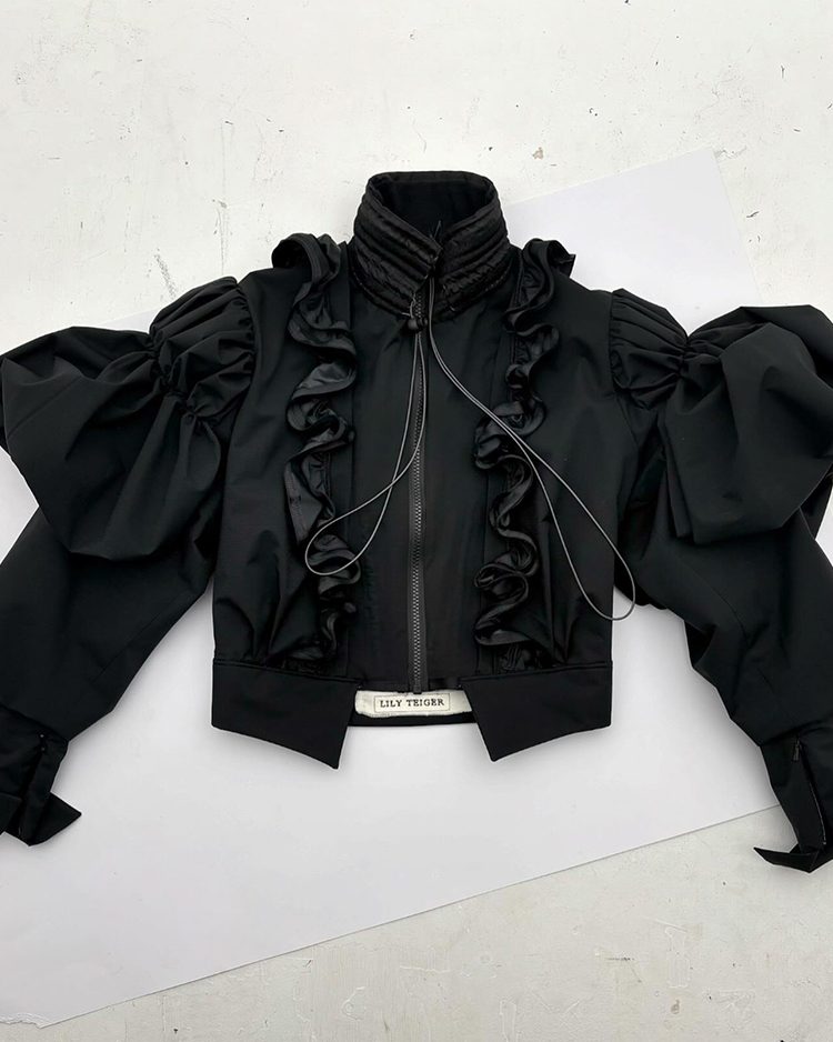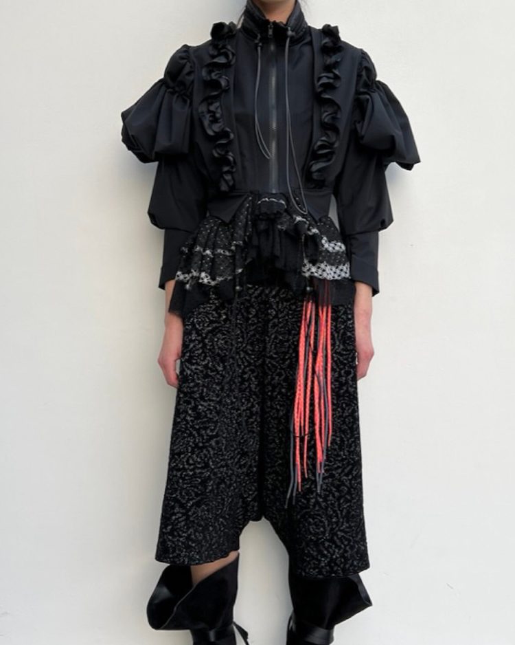 作品风格上打破了传统女性服装的轮廓,她巧妙通过创新的面料技术和鲜明的对比,平衡了历史与现代的元素,展现出现代女性的别样个性。蕾丝与丝绸的结合散发神秘气息,结构感十足的夹克与更加宽松的服装叠穿,表达了记忆与现实交织的视觉感。