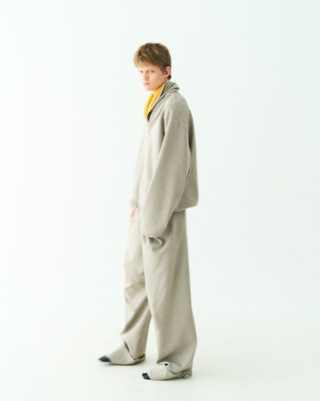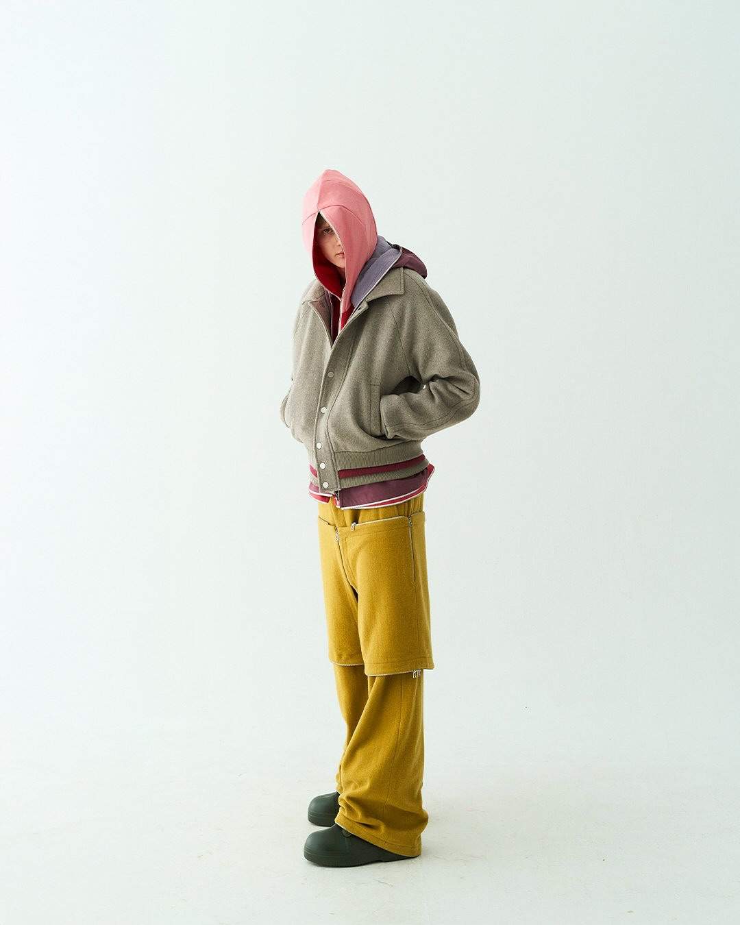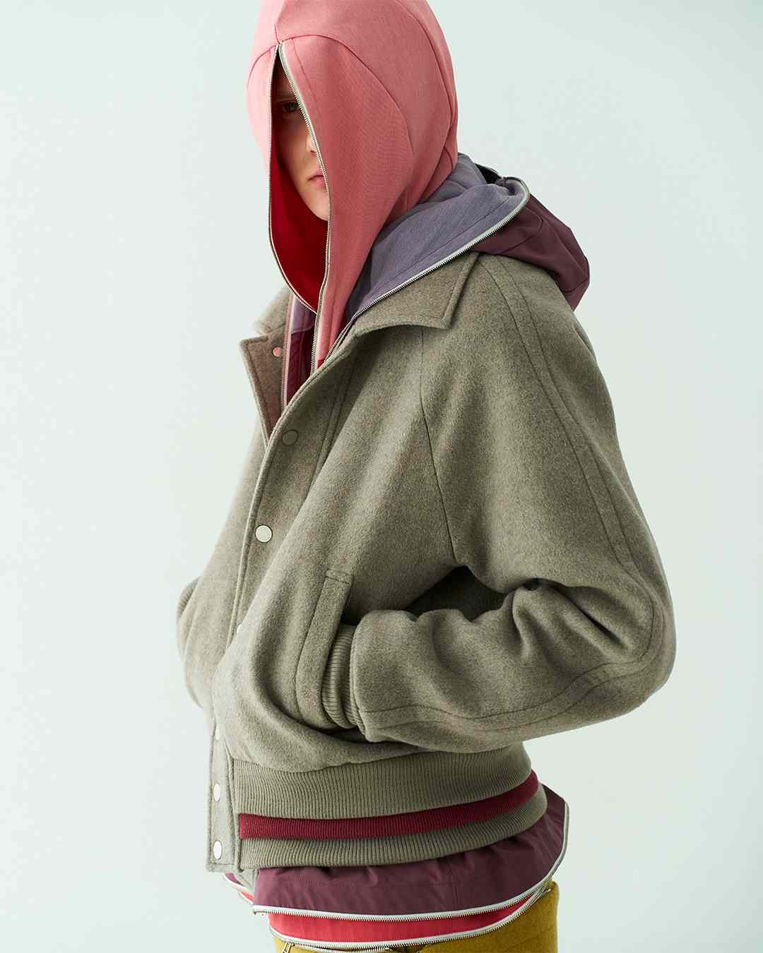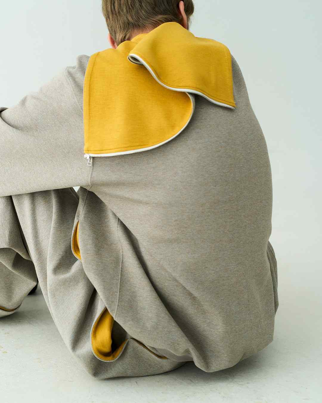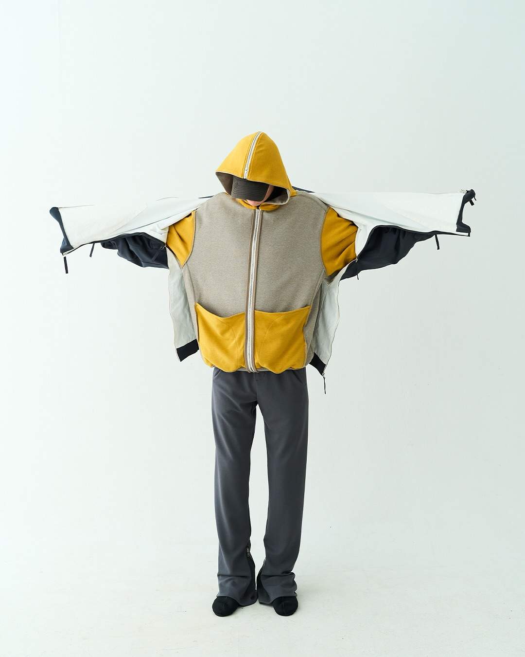 和很多刚起步的品牌一样,因为各方面成本受限的缘故无法触及到复杂工艺,DDAILIES 便选择从更易搭建出审美辨识度的基础款卫衣卫裤以及经典夹克廓形入手,将拉链卫衣以多裁片拼接以及多拉链开合的创意方式来替代复杂工艺的呈现,并将其命名为「Interacting Hooded Jacket」,在另一个层面为基础款爱好者打造出变形、反转以及层次感塑造的多元互动,无论是单独着用 DDAILIES 单品亦或是全身着用都能带来令人耳目一新的视觉效果。