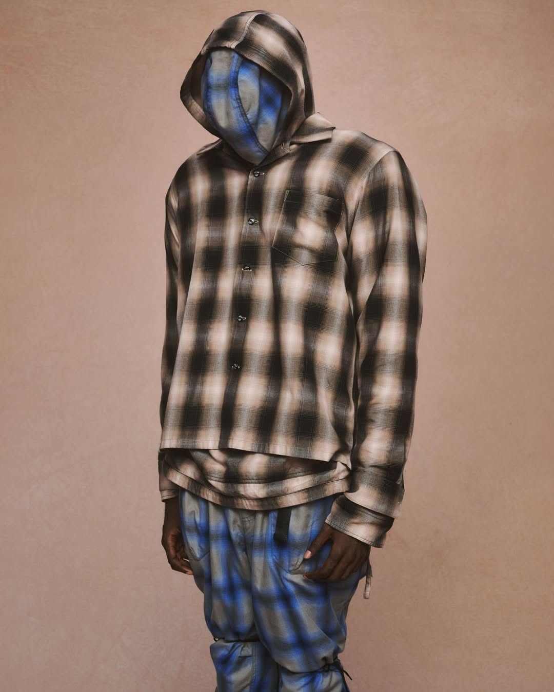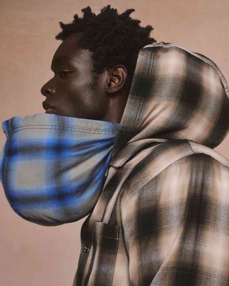 而在衬衫、针织衫以及卫衣短袖等内搭单品层面,bal 便开始挥发天马行空的想象力,连帽设定的格纹衬衫、透视针织 Polo 衫,破坏做旧卫衣等等与基础款外套单品形成鲜明对比,一动一静之间赋予 bal 的造型体系更多时装元素考量,视觉层面亦更有穿透力。