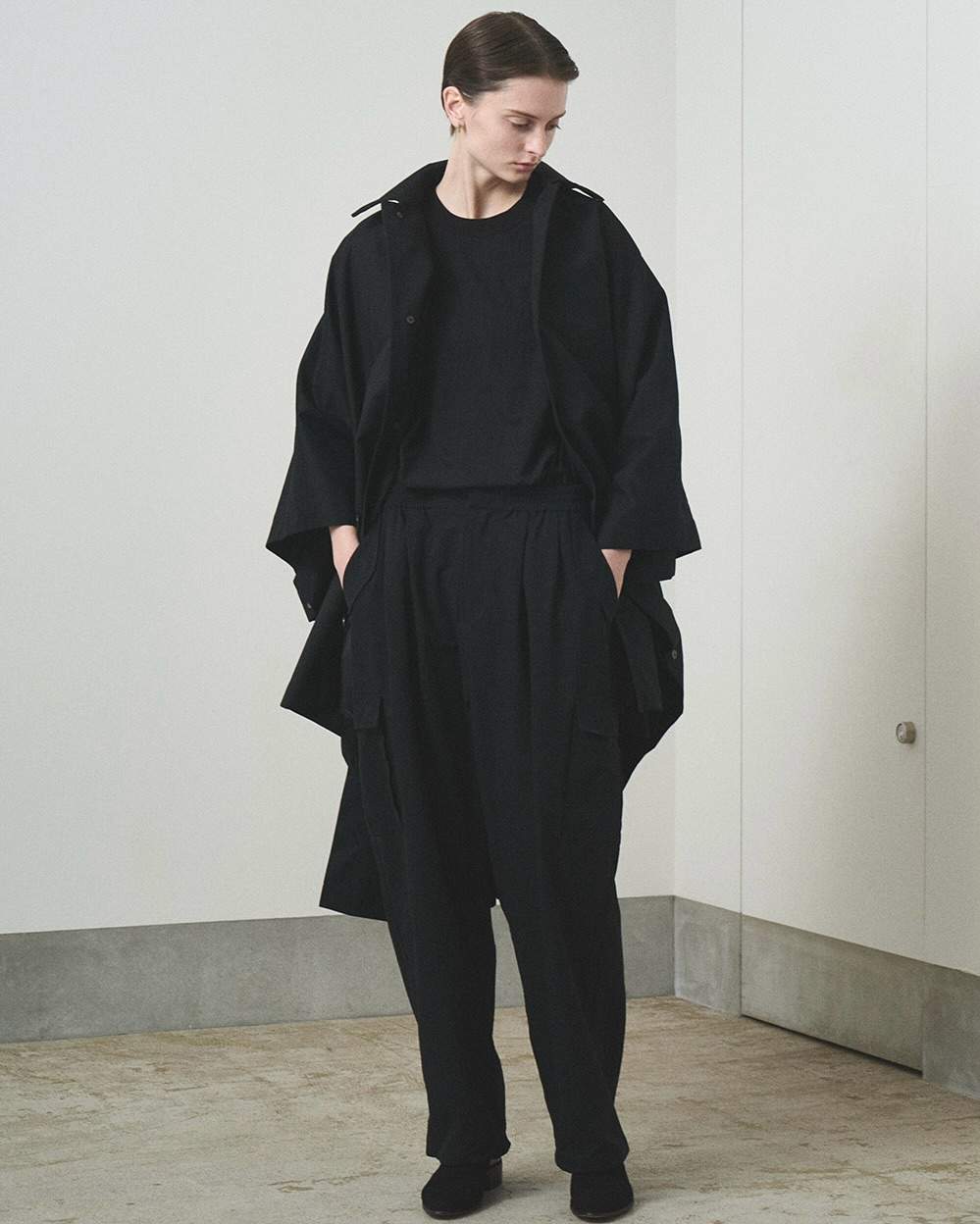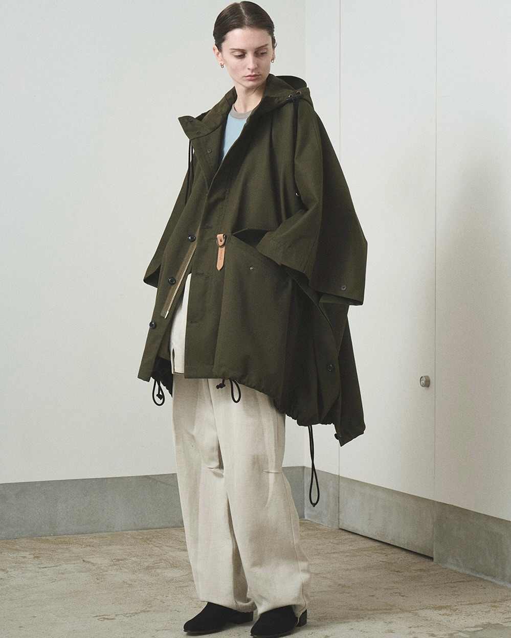 在不久前发售的 2025 春夏系列中亦是如此,宽松剪裁的大衣、斗篷以及衬衫的层次呼应下脱离流行趋势与审美周期的松弛感,TROVE 这种似乎有些沉默的时尚语言在简洁的线条廓形中往往能透出不俗的力量感。
