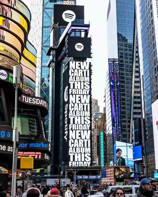 凭借万众期待的新专辑《MUSIC》,Playboi Carti 在 2025 年开年迎来震撼性回归。这张专辑早在正式上线前,就以各种提前发布的预告、 MV 和「泄曲」吸引了广泛关注,成为音乐与时尚领域热议的焦点。为了支持专辑上线,Spotify 在洛杉矶、纽约和迈阿密等主要城市布置了大规模户外广告,展示了「STREETS READY」「SORRY4 DA WAIT」「I AM MUSIC MF」等标语,营造出强烈的视觉冲击,热度不容小觑。