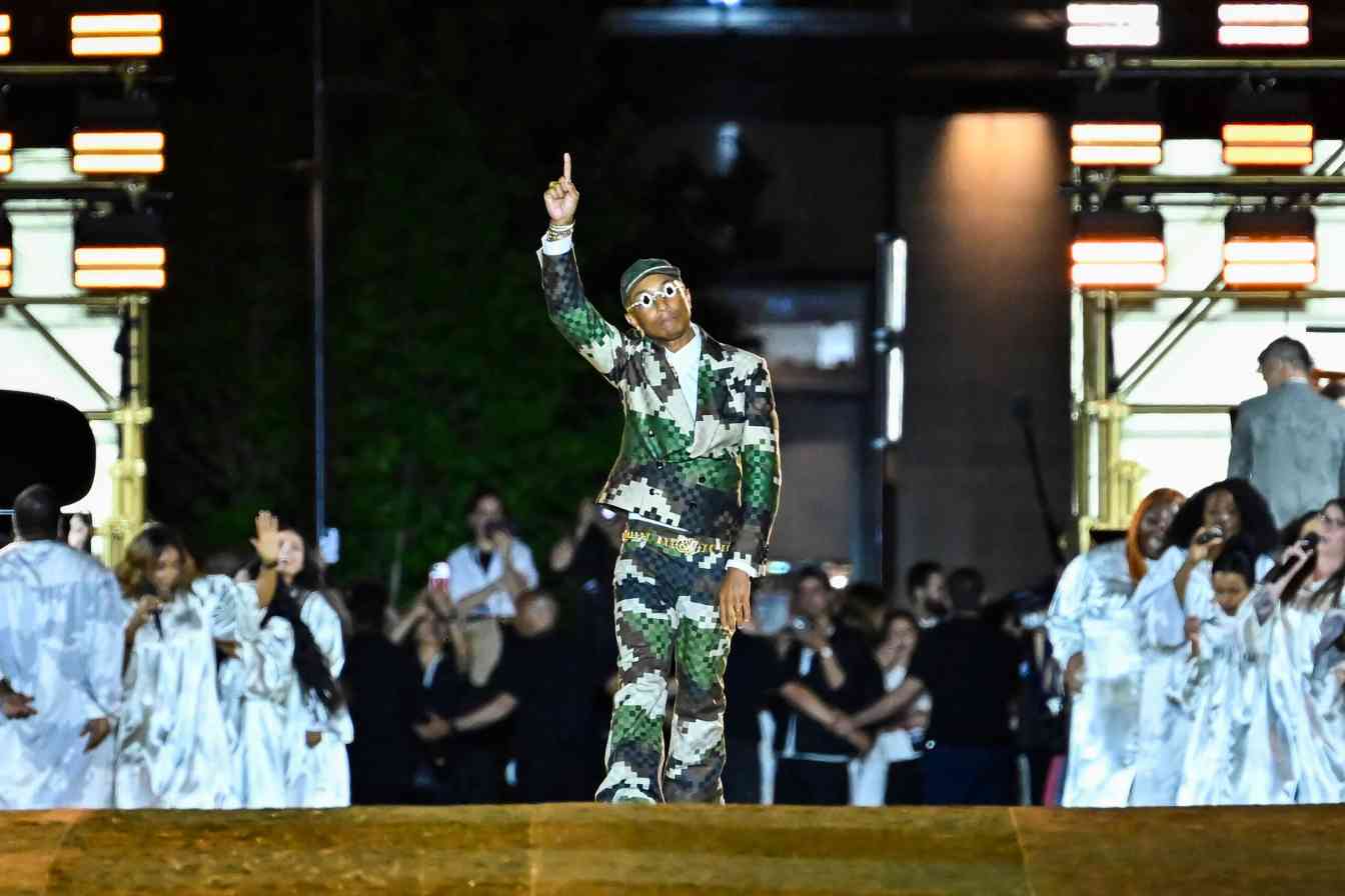 大秀开始,由 Pharrell Williams 创作的《Triumphus Cosmos(宇宙的胜利)》缓缓响起,此番这位品牌创意总监将自身音乐才能、资源回馈到品牌中,与 John Legen、Niles Rodger 等黑人歌手合作打造 3 首原创曲目,均由 Voices of Fire 合唱团和新桥管弦乐队在现场演奏。